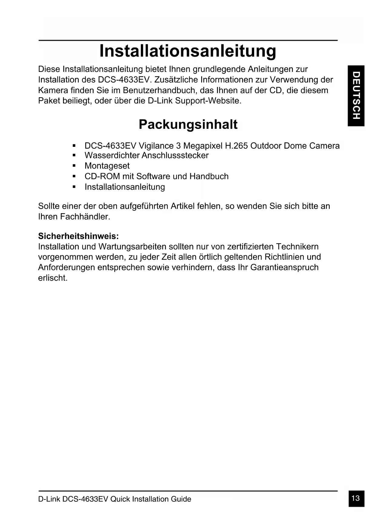 DEUTSCH Installationsanleitung Diese Installationsanleitung bietet Ihnen grundlegende Anleitungen zur Installation des DCS-4633EV. Zusätzliche Informationen zur Verwendung der Kamera nden Sie im Benutzerhandbuch, das Ihnen auf der CD, die diesem Paket beiliegt, oder über die D-Link Support-Website. Packungsinhalt DCS-4633EV Vigilance 3 Megapixel H.265 Outdoor Dome Camera Wasserdichter Anschlussstecker Montageset CD-ROM mit Software und Handbuch Installationsanleitung Sollte einer der oben aufgeführten Artikel fehlen, so wenden Sie sich bitte an Ihren Fachhändler. Sicherheitshinweis: Installation und Wartungsarbeiten sollten nur von zertizierten Technikern vorgenommen werden, zu jeder Zeit allen örtlich geltenden Richtlinien und Anforderungen entsprechen sowie verhindern, dass Ihr Garantieanspruch erlischt.D-Link DCS-4633EV Quick Installation Guide