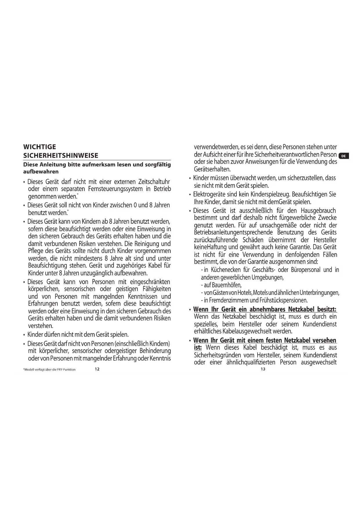 - Dieses Gerät darf nicht von Personen (einschließlich Kindern) mit körperlicher, sensorischer odergeistiger Behinderung oder von Personen mit mangelnder Erfahrung oder Kenntnis *Modell verfügt über die FRY-Funktion1514