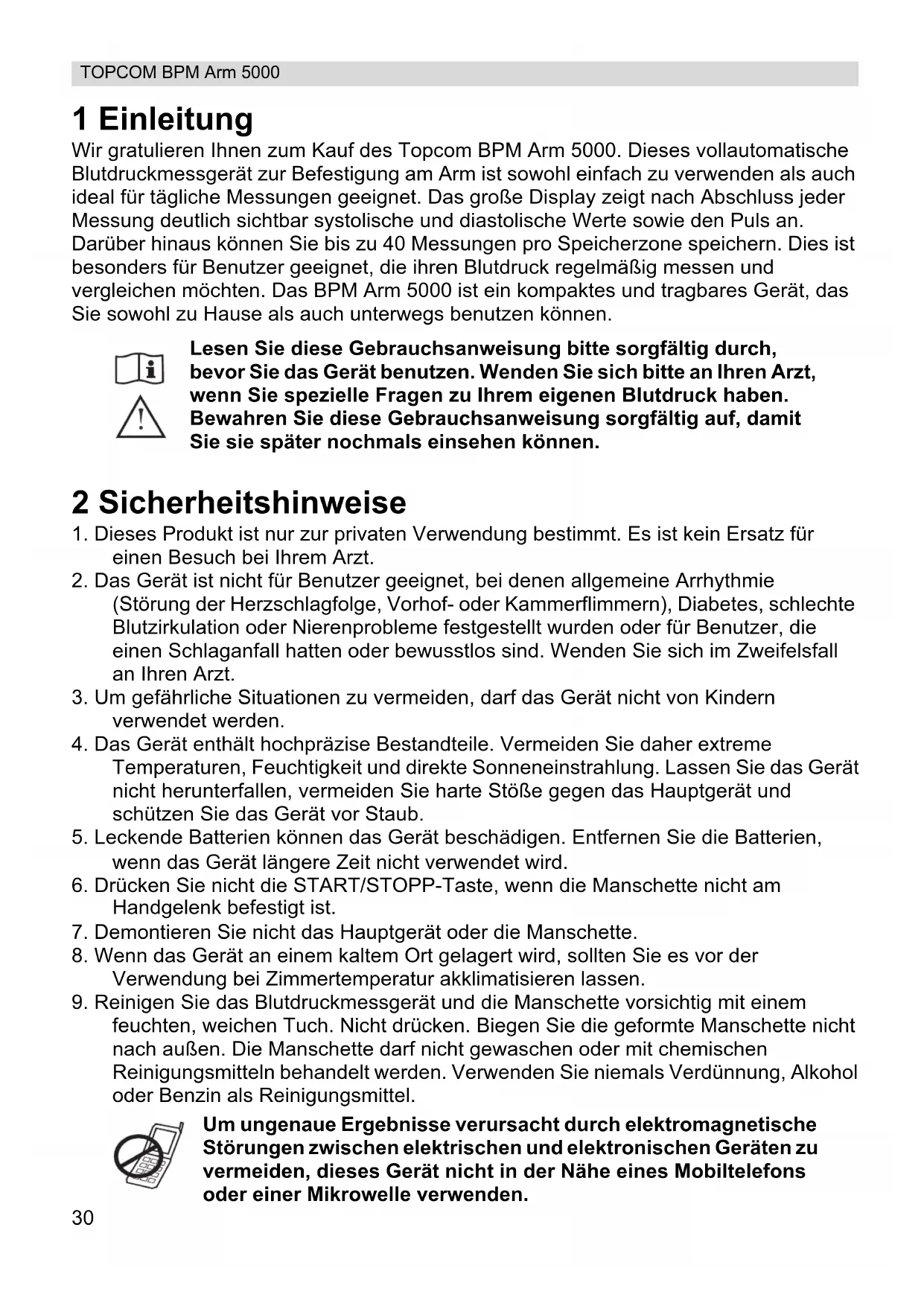 feuchten, weichen Tuch. Nicht drücken. Biegen Sie die geformte Manschette nicht nach außen. Die Manschette darf nicht gewaschen oder mit chemischen Reinigungsmitteln behandelt werden. Verwenden Sie niemals Verdünnung, Alkohol oder Benzin als Reinigungsmittel. Lesen Sie diese Gebrauchsanweisung bitte sorgfältig durch, bevor Sie das Gerät benutzen. Wenden Sie sich bitte an Ihren Arzt, wenn Sie spezielle Fragen zu Ihrem eigenen Blutdruck haben. Bewahren Sie diese Gebrauchsanweisung sorgfältig auf, damit Sie sie später nochmals einsehen können. Um ungenaue Ergebnisse verursacht durch elektromagnetische Störungen zwischen elektrischen und elektronischen Geräten zu vermeiden, dieses Gerät nicht in der Nähe eines Mobiltelefons oder einer Mikrowelle verwenden.31 DEUTSCH TOPCOM BPM Arm 5000 3 Blutdruck