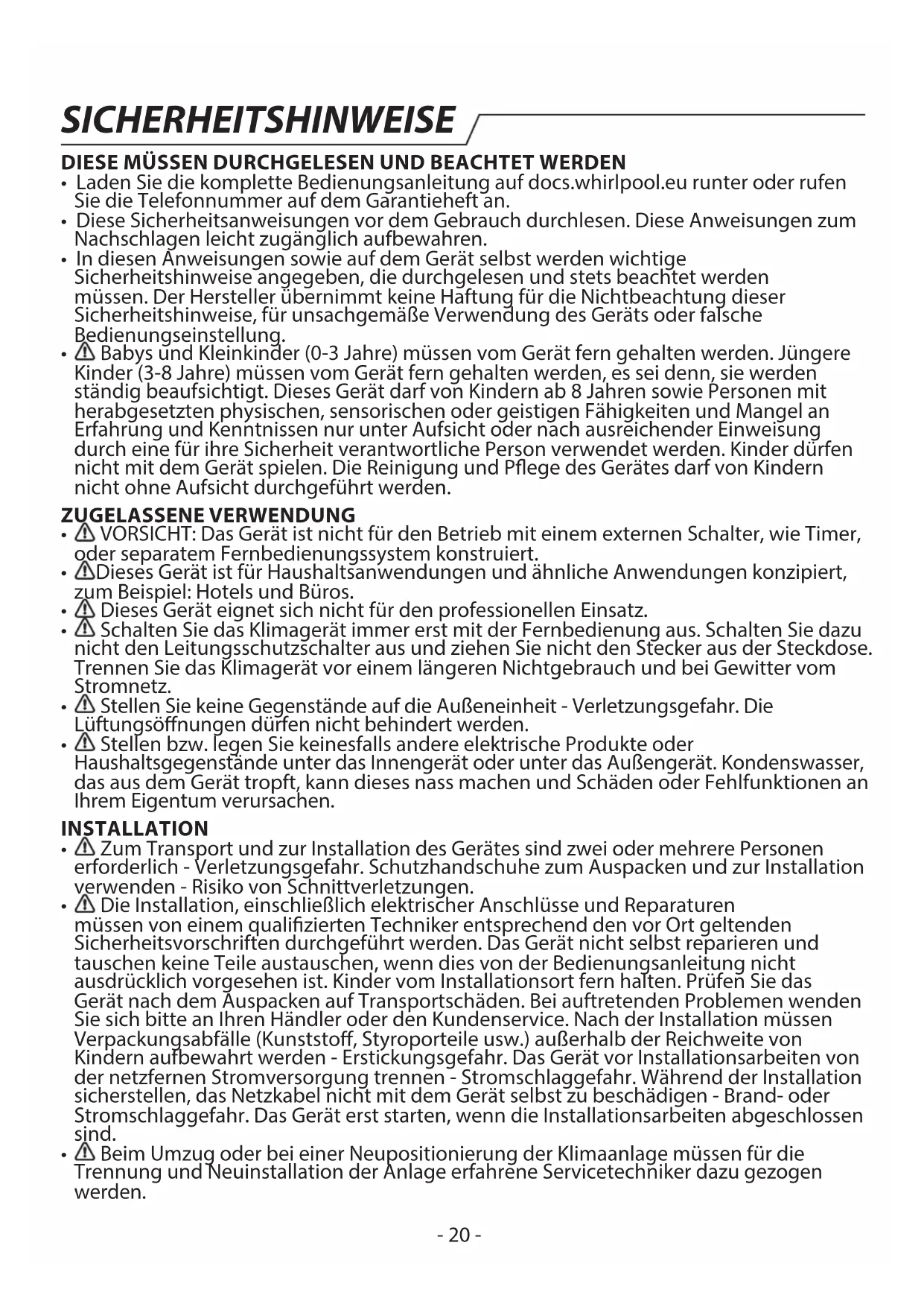 - Ausschalten des Geräts: Drücken Sie diese Taste bei eingeschaltetem Gerät, so wird es ausgeschaltet. Hinweis: Drücken Sie diese Taste immer nur kurz, längeres Drücken kann zu Funktionsstörungen führen. Automatischer Wiederanlauf Um die automatische Wiederanlauf-Funktion zu aktivieren, schalten Sie die Stromversorgung ein, drücken die ON/OFF-Taste der Inneneinheit und halten sie länger als 5 Sekunden gedrückt. Danach ertönt ein Hinweiston und der automatische Wiederanlauf ist aktiviert. Wenn die automatische Wiederanlauf-Funktion aktiviert ist, drücken Sie die ON/OFF-Taste der Inneneinheit und halten sie länger als 5 Sekunden gedrückt. Danach ertönt ein Hinweiston, der automatische Wiederanlauf ist deaktiviert und das Klimagerät in den Standby-Modus geschaltet. Entsorgung der Batterien Leisten Sie einen Beitrag zur Ressourcenschonung.Trennen Sie die Batterien vom Hausmüll und recyceln Sie diese über das kostenlose Batterie-Rückgabesystem an Ihrem Wohnort. Abb. A Abb. B Abb. C Abb. D Abb. E Filter Reset-Taste EIN/AUS- Schalter EIN/AUS- Schalter- 33 - Installationsanweisung Aufstellungszeichnung Abstand zur Wand sollte über 50 mm seinAbstand zur Decke sollte über 200 mm seinAbstand zur Wand sollte über 50 mm sein Für weitere Informationen gehen Sie auf : docs.whirlpool.eu runtergeladen werden HINWEIS: Die obige Abbildung ist nur eine schematische Darstellung des Geräts, die evtl. nicht genau mit dem von Ihnen erworbenen Gerät übereinstimmt. Die Installation muss entsprechend den geltenden Vorschriften für Elektroinstallationen von einem Fachbetrieb vorgenommen werden. Abstand zum Fußboden sollte über 2500 mm sein Inneneinheit Außeneinheit Abstand des Lufteintritts zur Wand muss mehr als 250 mm betragenAbstand des Lufteintritts zur Wand muss mehr als 250 mm betragen Abstand des Luftauslass zur Wand muss mehr als 500 mm betragen Über 250 mm Bei der Installation des Verbindungskabels sicherstellen, dass Kabelfarben und Klemmennummern an Außeneinheit und Inneneinheit übereinstimmen. Kabelspezikation Leistung (Btu/h) Netzkabel Netzanschlusskabel Typ Normaler Querschnittsbereich Typ Normaler Querschnittsbereich7K, 9K, 12K H07RN-F 1,0mm X3 H07RN-F 1,0mm
