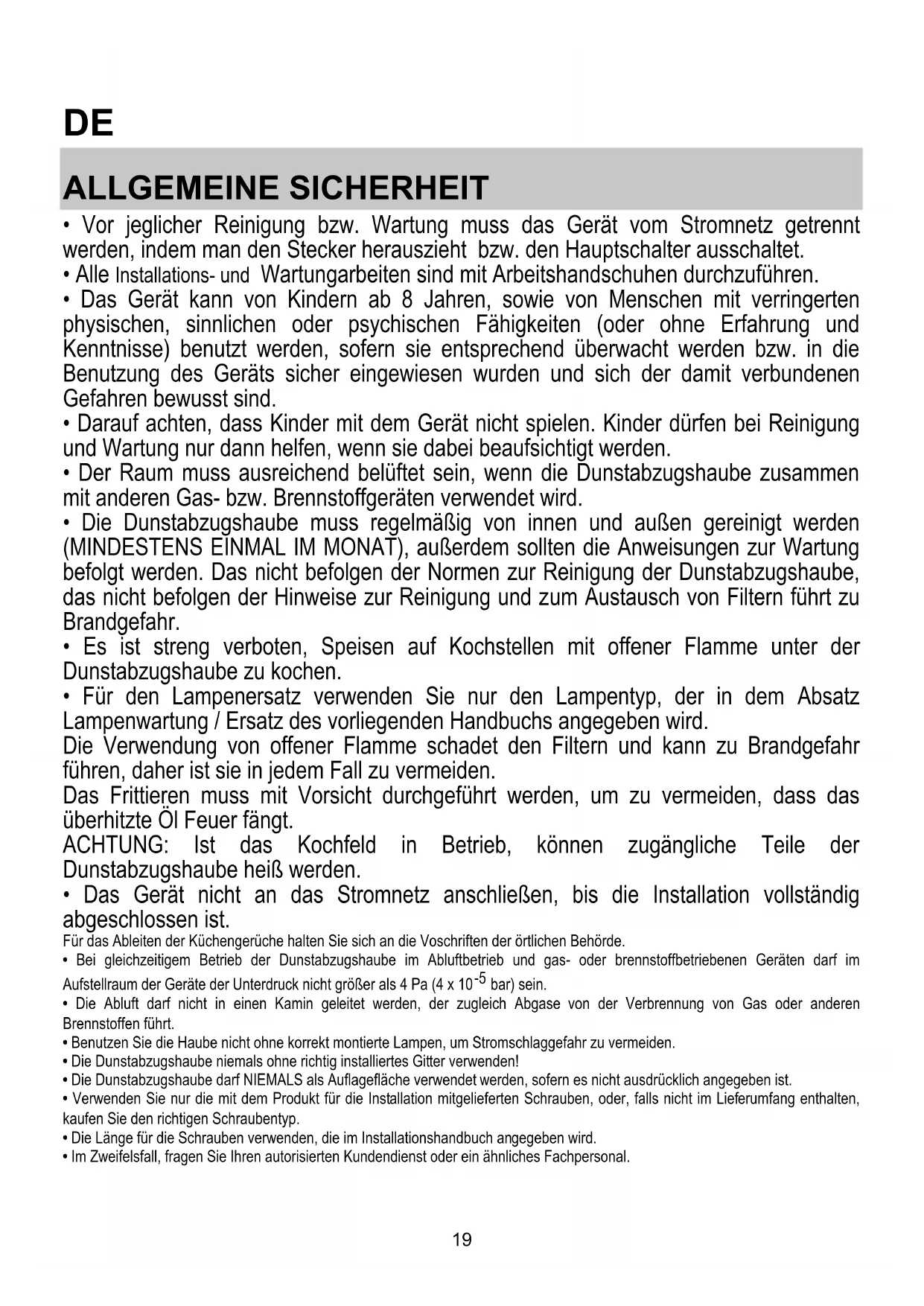 - Bei gleichzeitigem Betrieb der Dunstabzugshaube im Abluftbetrieb und gas- oder brennstoffbetriebenen Geräten darf im Aufstellraum der Geräte der Unterdruck nicht größer als 4 Pa (4 x 10 bar) sein.