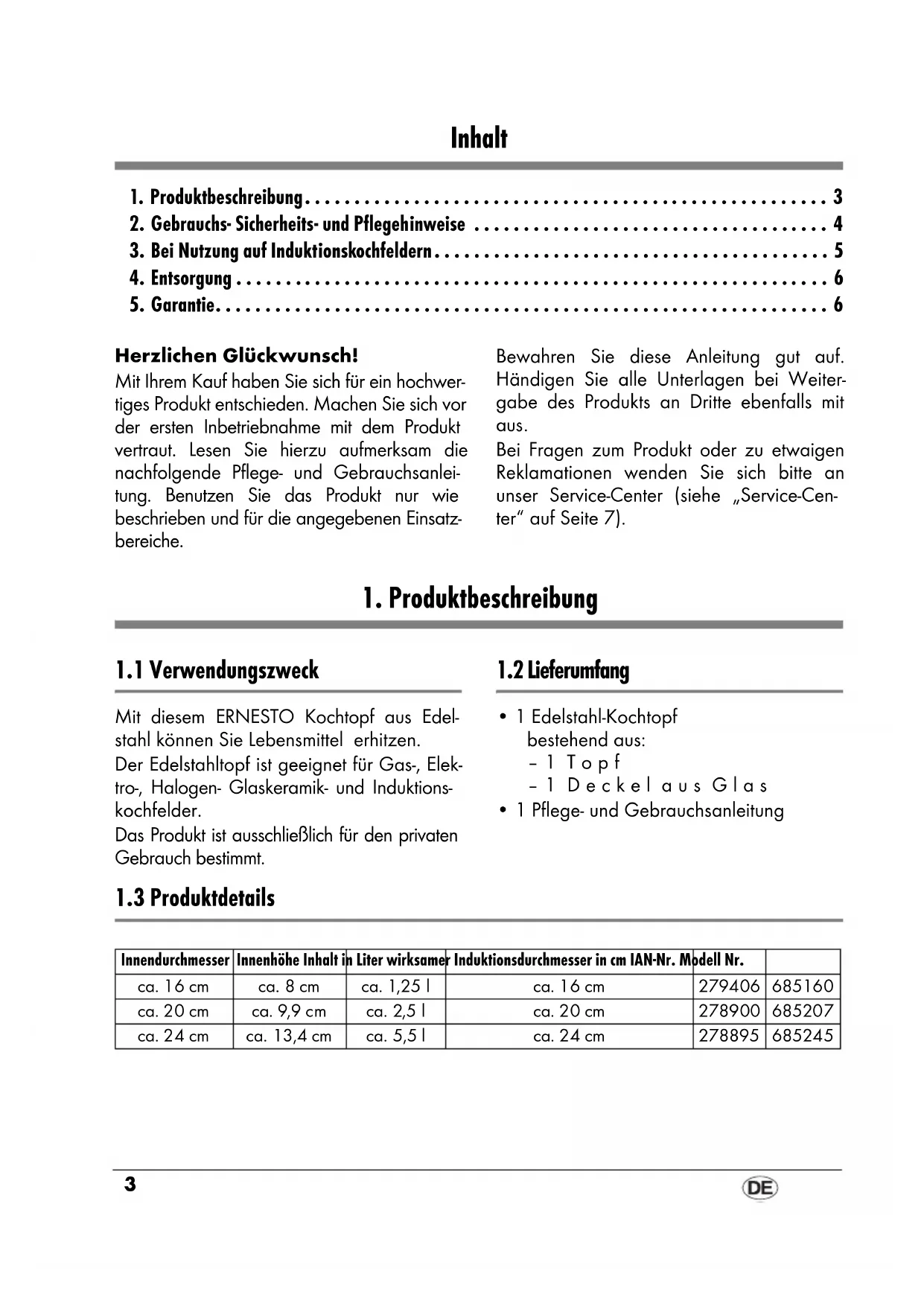 Innendurchmesser Innenhöhe Inhalt in Liter wirksamer Induktionsdurchmesser in cm IAN-Nr. Modell Nr. ca. 16 cm ca. 8 cm ca. 1,25 l ca. 16 cm 279406 685160 ca. 20 cm ca. 9,9 cm ca. 2,5 l ca. 20 cm 278900 685207 ca. 24 cm ca. 13,4 cm ca. 5,5 l ca. 24 cm 278895 6852454