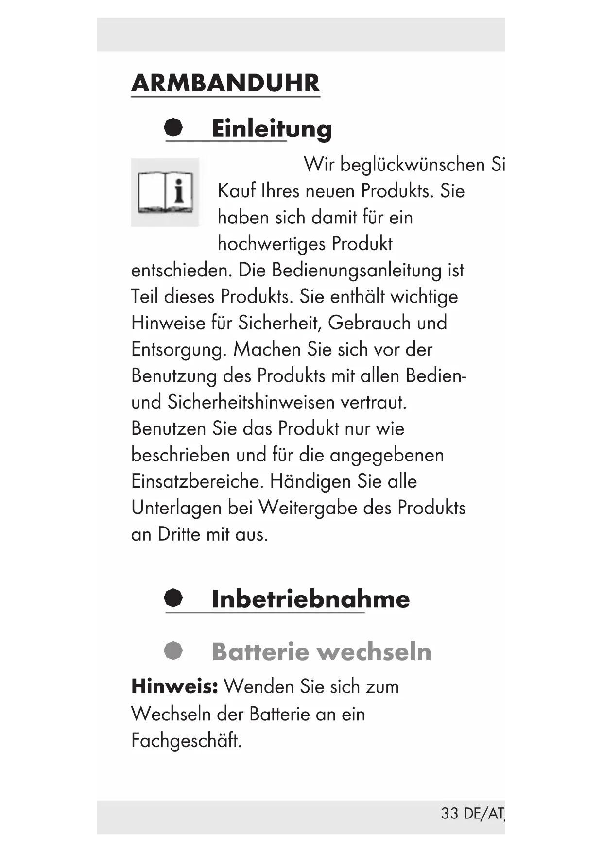 gegen den Uhrzeigersinn, um den Beginn einer Zeitmessung zu markieren. § Reinigung und Pflege Reinigen Sie das Produkt nur äußerlich mit einem weichen trockenen Tuch.36 DE/AT/CH § Entsorgung Die Verpackung besteht aus umweltfreundlichen Materialien, die Sie über die örtlichen Recyclingstellen entsorgen können. Möglichkeiten zur Entsorgung des ausgedienten Produkts erfahren Sie bei Ihrer Gemeinde oder Stadtverwaltung. Werfen Sie Ihr Produkt, wenn es ausgedient hat, im Interesse des Umweltschutzes nicht in den Hausmüll, sondern führen Sie es einer fachgerechten Entsorgung zu. Über Sammelstellen und deren Öffnungszeiten können Sie sich bei Ihrer zuständigen Verwaltung informieren. Defekte oder verbrauchte Batterien müssen gemäß Richtlinie 2006 / 66 / EG und deren Änderungen recycelt werden. Geben Sie Batterien und / oder das Gerät über die angebotenen Sammeleinrichtungen zurück.37 DE/AT/CH Umweltschäden durch falsche Entsorgung der Batterien! Batterien dürfen nicht über den Hausmüll entsorgt werden. Sie können giftige Schwermetalle enthalten und unterliegen der Sondermüllbehandlung. Die chemischen Symbole der Schwermetalle sind wie folgt: Cd = Cadmium, Hg = Quecksilber, Pb = Blei. Geben Sie deshalb verbrauchte Batterien bei einer kommunalen Sammelstelle ab.38 DE/AT/CH § GARANTIE Das Produkt wurde nach strengen Qualitätsrichtlinien sorgfältig produziert und vor Anlieferung gewissenhaft geprüft. Im Falle von Mängeln dieses Produkts stehen Ihnen gegen den Verkäufer des Produkts gesetzliche Rechte zu. Diese gesetzlichen Rechte werden durch unsere im Folgenden dargestellte Garantie nicht eingeschränkt. Sie erhalten auf dieses Produkt 3 Jahre Garantie ab Kaufdatum. Die Garantiefrist beginnt mit dem Kaufdatum. Bitte bewahren Sie den Original-Kassenbon gut auf. Diese Unterlage wird als Nachweis für den Kauf benötigt. Tritt innerhalb von 3 Jahren ab dem Kaufdatum dieses Produkts ein Material- oder Fabrikationsfehler auf, wird das Produkt von uns – nach unserer Wahl – für Sie kostenlos repariert oder ersetzt. Diese Garantie verfällt, wenn das Produkt beschädigt, nicht sachgemäß benutzt oder gewartet wurde.39 DE/AT/CH Die Garantieleistung gilt für Material- oder Fabrikationsfehler. Diese Garantie erstreckt sich nicht auf Produktteile, die normaler Abnutzung ausgesetzt sind (z. B. Batterien) und daher als Verschleißteile angesehen werden können oder für Beschädigungen an zerbrechlichen Teilen, z. B. Schalter, Akkus oder die aus Glas gefertigt sind. Von der Garantieleistung ausgeschlossen ist ebenfalls das Nachlassen der Wasserdichtheit. Der Zustand der Wasserdichtheit ist keine bleibende Eigenschaft und sollte daher regelmäßig gewartet werden. Bitte beachten Sie, dass durch das Öffnen und Reparieren Ihrer Uhr durch Personen, die hierzu nicht ermächtigt sind, Ihre Garantieansprüche erlöschen.IAN 282652 OWIM GmbH & Co. KG Stiftsbergstraße 1 DE-74167 Neckarsulm GERMANY Model No.: HG01775A/HG01775B/ HG01775C/HG01775D/HG01775E/ HG01775F/HG01775G/HG01775H/ HG01775I/HG01775J/HG01775K/HG01775L/ HG01775M/HG01775N/HG01775O/ HG01775P/HG01775Q/HG01775R/ HG01775S/HG01775T Version: 02/2017