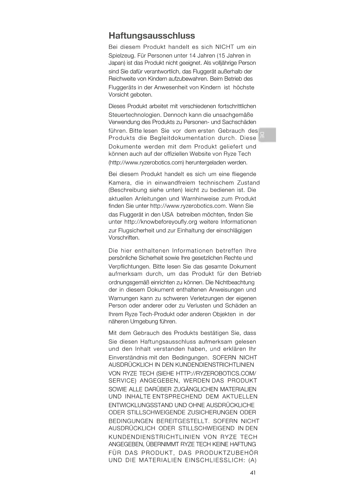 Haftungsausschluss Bei diesem Produkt handelt es sich NICHT um ein Spielzeug. Für Personen unter 14 Jahren (15 Jahren in Japan) ist das Produkt nicht geeignet. Als volljährige Person sind Sie dafür verantwortlich, das Fluggerät außerhalb der Reichweite von Kindern aufzubewahren. Beim Betrieb des Fluggeräts in der Anwesenheit von Kindern ist höchste Vorsicht geboten. Dieses Produkt arbeitet mit verschiedenen fortschrittlichen Steuertechnologien. Dennoch kann die unsachgemäße Verwendung des Produkts zu Personen- und Sachschäden führen. Bitte lesen Sie vor dem ersten Gebrauch des Produkts die Begleitdokumentation durch. Diese Dokumente werden mit dem Produkt geliefert und können auch auf der offiziellen Website von Ryze Tech (http://www.ryzerobotics.com) heruntergeladen werden. Bei diesem Produkt handelt es sich um eine fliegende Kamera, die in einwandfreiem technischem Zustand (Beschreibung siehe unten) leicht zu bedienen ist. Die aktuellen Anleitungen und Warnhinweise zum Produkt nden Sie unter http://www.ryzerobotics.com. Wenn Sie das Fluggerät in den USA betreiben möchten, nden Sie unter http://knowbeforeyoufly.org weitere Informationen zur Flugsicherheit und zur Einhaltung der einschlägigen Vorschriften. Die hier enthaltenen Informationen betreffen Ihre persönliche Sicherheit sowie Ihre gesetzlichen Rechte und Verpflichtungen. Bitte lesen Sie das gesamte Dokument aufmerksam durch, um das Produkt für den Betrieb ordnungsgemäß einrichten zu können. Die Nichtbeachtung der in diesem Dokument enthaltenen Anweisungen und Warnungen kann zu schweren Verletzungen der eigenen Person oder anderer oder zu Verlusten und Schäden an Ihrem Ryze Tech-Produkt oder anderen Objekten in der näheren Umgebung führen. Mit dem Gebrauch des Produkts bestätigen Sie, dass Sie diesen Haftungsausschluss aufmerksam gelesen und den Inhalt verstanden haben, und erklären Ihr Einverständnis mit den Bedingungen. SOFERN NICHT