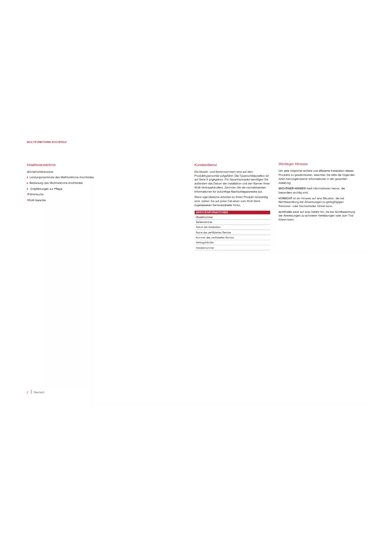 Deutsch Inhaltsverzeichnis 3 Sicherheitshinweise5 Leistungsmerkmale des Multifunktions-Kochfeldes6 Bedienung des Multifunktions-Kochfeldes6 Empfehlungen zur Pege7 Fehlersuche7 Wolf-Garantie MULTIFUNKTIONS-KOCHFELD Kundendienst Die Modell- und Seriennummern sind auf dem Produkttypenschild aufgeführt. Die Typenschildposition ist auf Seite 5 angegeben. Für Garantiezwecke benötigen Sie außerdem das Datum der Installation und den Namen Ihres Wolf-Vertragshändlers. Zeichnen Sie die nachstehenden Informationen für zukünftige Nachschlagezwecke auf. Wenn irgendwelche Arbeiten an Ihrem Produkt notwendig sind, ziehen Sie auf jeden Fall einen vom Wolf-Werk zugelassenen Serviceanbieter hinzu. SERVICEINFORMATIONEN Modellnummer Seriennummer Datum der Installation Name des zertizierten Service Nummer des zertizierten Service Vertragshändler Händlernummer Wichtiger Hinweis Um eine möglichst sichere und efziente Installation dieses Produkts zu gewährleisten, beachten Sie bitte die folgenden Arten hervorgehobener Informationen in der gesamten Anleitung: WICHTIGER HINWEIS hebt Informationen hervor, die besonders wichtig sind. VORSICHT ist ein Hinweis auf eine Situation, die bei Nichtbeachtung der Anweisungen zu geringfügigen Personen- oder Sachschäden führen kann. ACHTUNG weist auf eine Gefahr hin, die bei Nichtbeachtung der Anweisungen zu schweren Verletzungen oder zum Tod führen kann.wolfappliance.com