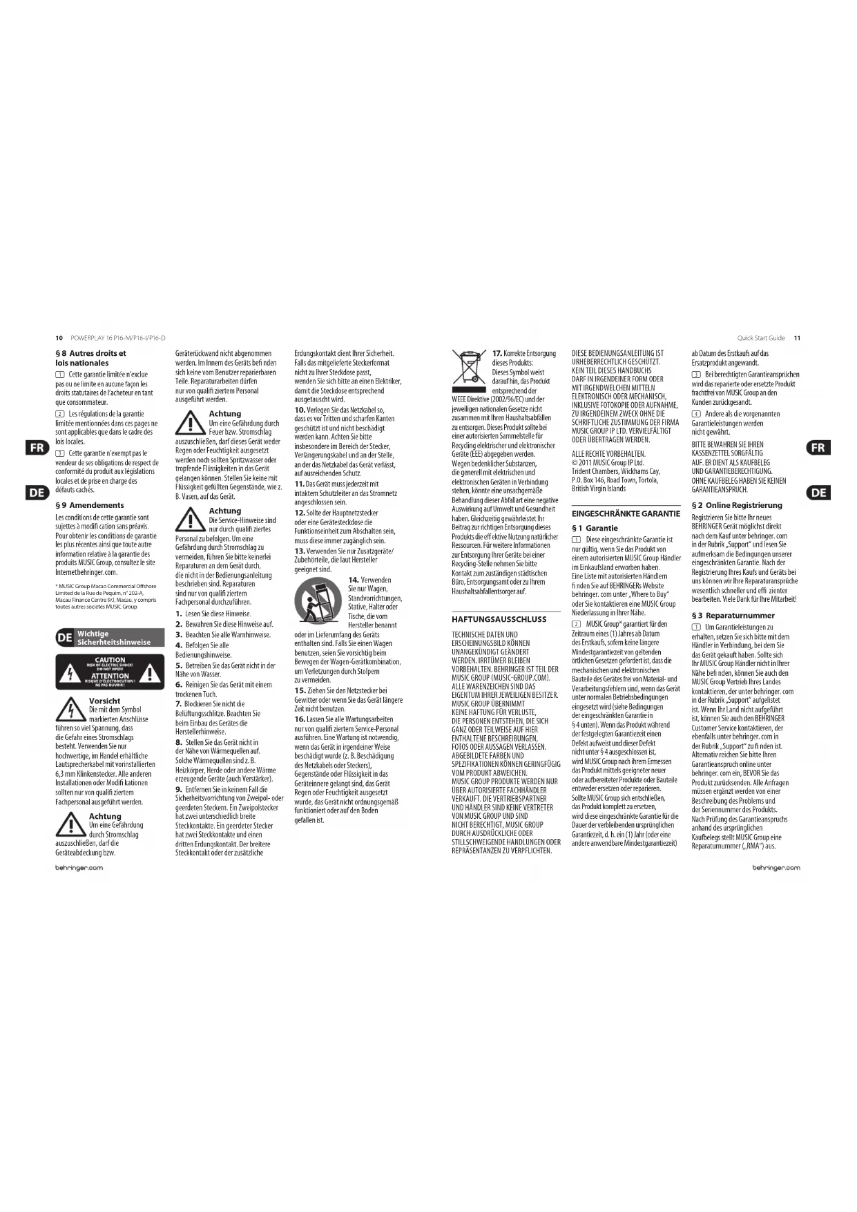 GARANTIEANSPRUCH. § 2 Online Registrierung Registrieren Sie bitte Ihr neues BEHRINGER Gerät möglichst direkt nach dem Kauf unter behringer. com in der Rubrik „Support“ und lesen Sie aufmerksam die Bedingungen unserer eingeschränkten Garantie. Nachder Registrierung Ihres Kaufs und Geräts bei uns können wir Ihre Reparaturansprüche wesentlich schneller und e zienter bearbeiten. Viele Dank für IhreMitarbeit! § 3 Reparaturnummer (1) Um Garantieleistungen zu erhalten, setzen Sie sich bitte mit dem Händler in Verbindung, bei dem Sie das Gerät gekauft haben. Sollte sich Ihr MUSIC Group Händler nicht in Ihrer Nähe be nden, können Sie auch den MUSICGroup Vertrieb Ihres Landes kontaktieren, der unter behringer. com in der Rubrik „Support“ aufgelistet ist. Wenn Ihr Land nicht aufgeführt ist, können Sie auch den BEHRINGER Customer Service kontaktieren, der ebenfalls unter behringer. com in der Rubrik „Support“ zu nden ist. Alternativreichen Sie bitte Ihren Garantieanspruch online unter behringer. com ein, BEVOR Sie das Produkt zurücksenden. AlleAnfragen müssen ergänzt werden von einer Beschreibung des Problems und der Seriennummer des Produkts. NachPrüfung des Garantieanspruchs anhand des ursprünglichen Kaufbelegs stellt MUSICGroup eine Reparaturnummer („RMA“) aus. 10 11Quick Start GuidePOWERPLAY 16 P16 -M/P16-I/P16 -DInstruções de Segurança Importantes (2) Das Gerät muss anschließend im Originalkarton zusammen mit der Reparaturnummer an die von MUSICGroup genannte Adresse geschicktwerden. (3) Unfreie Sendungen werden nichtangenommen. § 4 Garantieausschluss (1) Diese eingeschränkte Garantie gilt nicht für Verschleißteile, wie Sicherungen und Batterien. Woanwendbar, gewährt MUSICGroup für neunzig (90) Tage ab Kaufdatum die Garantie, dass die im Produkt enthaltenen Röhren oder Anzeigen frei von Material- und Verarbeitungsfehlern sind. (2) Diese eingeschränkte Garantie gilt nicht für Produkte, die auf irgendeine Weise elektronisch oder mechanisch modi ziert wurden. Wenn ein Produkt verändert oder angepasst werden muss, damit es in einem Land, für das es ursprünglich nicht entwickelt oder hergestellt wurde, den geltenden technischen oder sicherheitstechnischen Standards auf nationaler oder lokaler Ebene entspricht, ist diese Veränderung/ Anpassung nicht als Material- oder Verarbeitungsfehler anzusehen. Dieseeingeschränkte Garantie umfasst nicht derartige Veränderungen/ Anpassungen unabhängig davon, obdiese ordnungsgemäß durchgeführt wurden oder nicht. MUSICGroup übernimmt im Rahmen dieser Garantie für derartige Veränderungen auch keineKosten. (3) Diese eingeschränkte Garantie gilt nur für die Hardware des Produkts. Sieschließt keine technische Unterstützung für die Anwendung der Hard- oder Software ein und sie gilt nicht für Software-Produkte, gleichgültig ob sie im Produkt enthalten sind oder nicht. DieSoftware wird im „IST-ZUSTAND“ geliefert, sofernihr keine besondere eingeschränkte Soft war e- G aran tiebe ilieg t. (4) Diese eingeschränkte Garantie erlischt, wenn die im Werk angebrachte Seriennummer verändert oder entferntwurde. (5) Diese eingeschränkte Garantie berechtigt nicht zur kostenlosen Inspektion und Wartung/Reparatur des Geräts, insbesondere wenn die Defekte auf unsachgemäße Benutzung zurückzuführen sind. DieGarantie gilt auch nicht für Defekte durch normale Abnutzung, besonders bei Fadern, Crossfadern, Potentiometern, Tasten, Gitarrensaiten, Leuchtmitteln und ähnlichenTeilen. (6) Unter diese eingeschränkte Garantie fallen auch keine Schäden/Defekte, die verursacht wurden durch:
