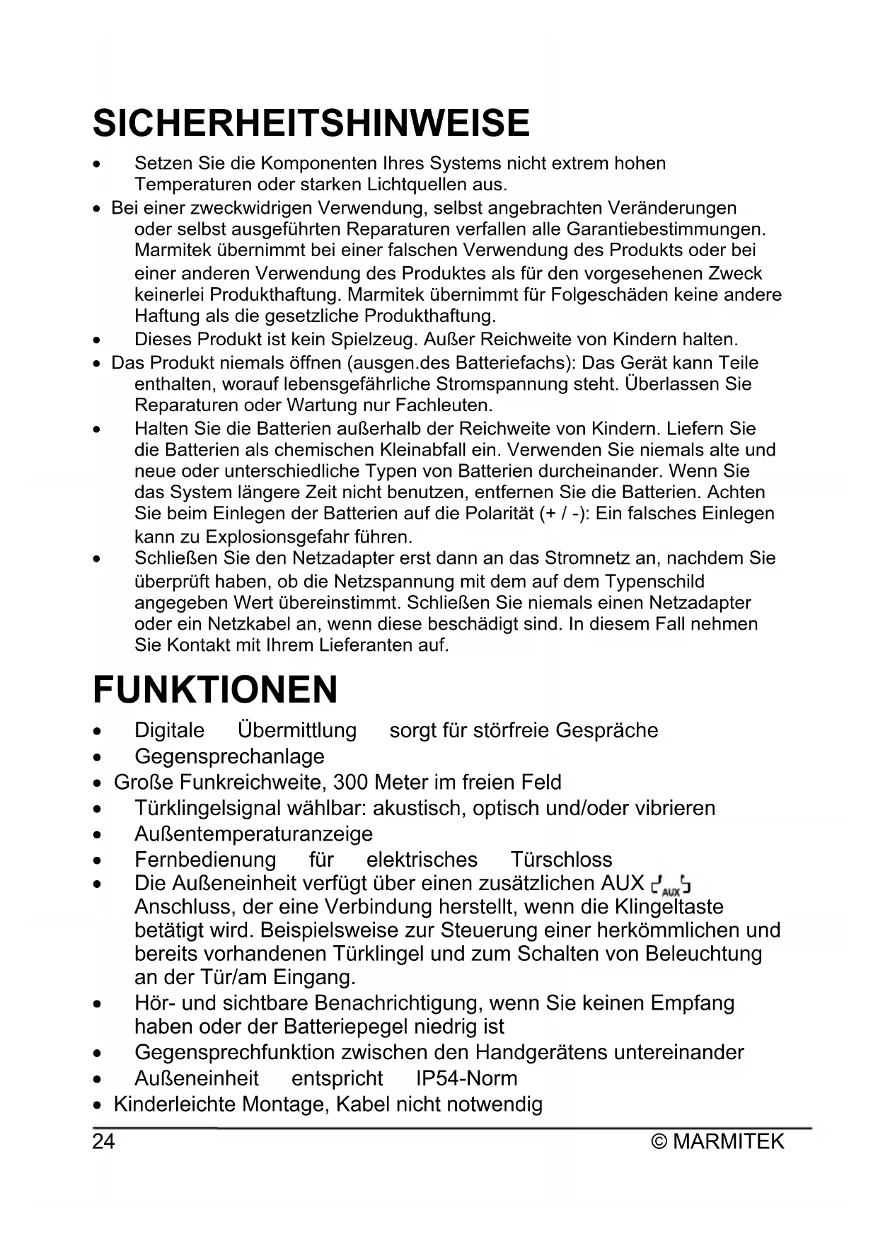 SICHERHEITSHINWEISE x Setzen Sie die Komponenten Ihres Systems nicht extrem hohen Temperaturen oder starken Lichtquellen aus. x Bei einer zweckwidrigen Verwendung, selbst angebrachten Veränderungen oder selbst ausgeführten Reparaturen verfallen alle Garantiebestimmungen. Marmitek übernimmt bei einer falschen Verwendung des Produkts oder bei einer anderen Verwendung des Produktes als für den vorgesehenen Zweck keinerlei Produkthaftung. Marmitek übernimmt für Folgeschäden keine andere Haftung als die gesetzliche Produkthaftung. x Dieses Produkt ist kein Spielzeug. Außer Reichweite von Kindern halten. x Das Produkt niemals öffnen (ausgen.des Batteriefachs): Das Gerät kann Teile enthalten, worauf lebensgefährliche Stromspannung steht. Überlassen Sie Reparaturen oder Wartung nur Fachleuten. x Halten Sie die Batterien außerhalb der Reichweite von Kindern. Liefern Sie die Batterien als chemischen Kleinabfall ein. Verwenden Sie niemals alte und neue oder unterschiedliche Typen von Batterien durcheinander. Wenn Sie das System längere Zeit nicht benutzen, entfernen Sie die Batterien. Achten Sie beim Einlegen der Batterien auf die Polarität (+ / -): Ein falsches Einlegen kann zu Explosionsgefahr führen. x Schließen Sie den Netzadapter erst dann an das Stromnetz an, nachdem Sie überprüft haben, ob die Netzspannung mit dem auf dem Typenschild angegeben Wert übereinstimmt. Schließen Sie niemals einen Netzadapter oder ein Netzkabel an, wenn diese beschädigt sind. In diesem Fall nehmen Sie Kontakt mit Ihrem Lieferanten auf. FUNKTIONEN x Digitale Übermittlung sorgt für störfreie Gespräche x Gegensprechanlage x Große Funkreichweite, 300 Meter im freien Feld x Türklingelsignal wählbar: akustisch, optisch und/oder vibrieren x Außentemperaturanzeige x Fernbedienung für elektrisches Türschloss x Die Außeneinheit verfügt über einen zusätzlichen AUX Anschluss, der eine Verbindung herstellt, wenn die Klingeltaste betätigt wird. Beispielsweise zur Steuerung einer herkömmlichen und bereits vorhandenen Türklingel und zum Schalten von Beleuchtung an der Tür/am Eingang. x Hör- und sichtbare Benachrichtigung, wenn Sie keinen Empfang haben oder der Batteriepegel niedrig ist x Gegensprechfunktion zwischen den Handgerätens untereinander x Außeneinheit entspricht IP54-Norm x Kinderleichte Montage, Kabel nicht notwendigDoorPhone 170