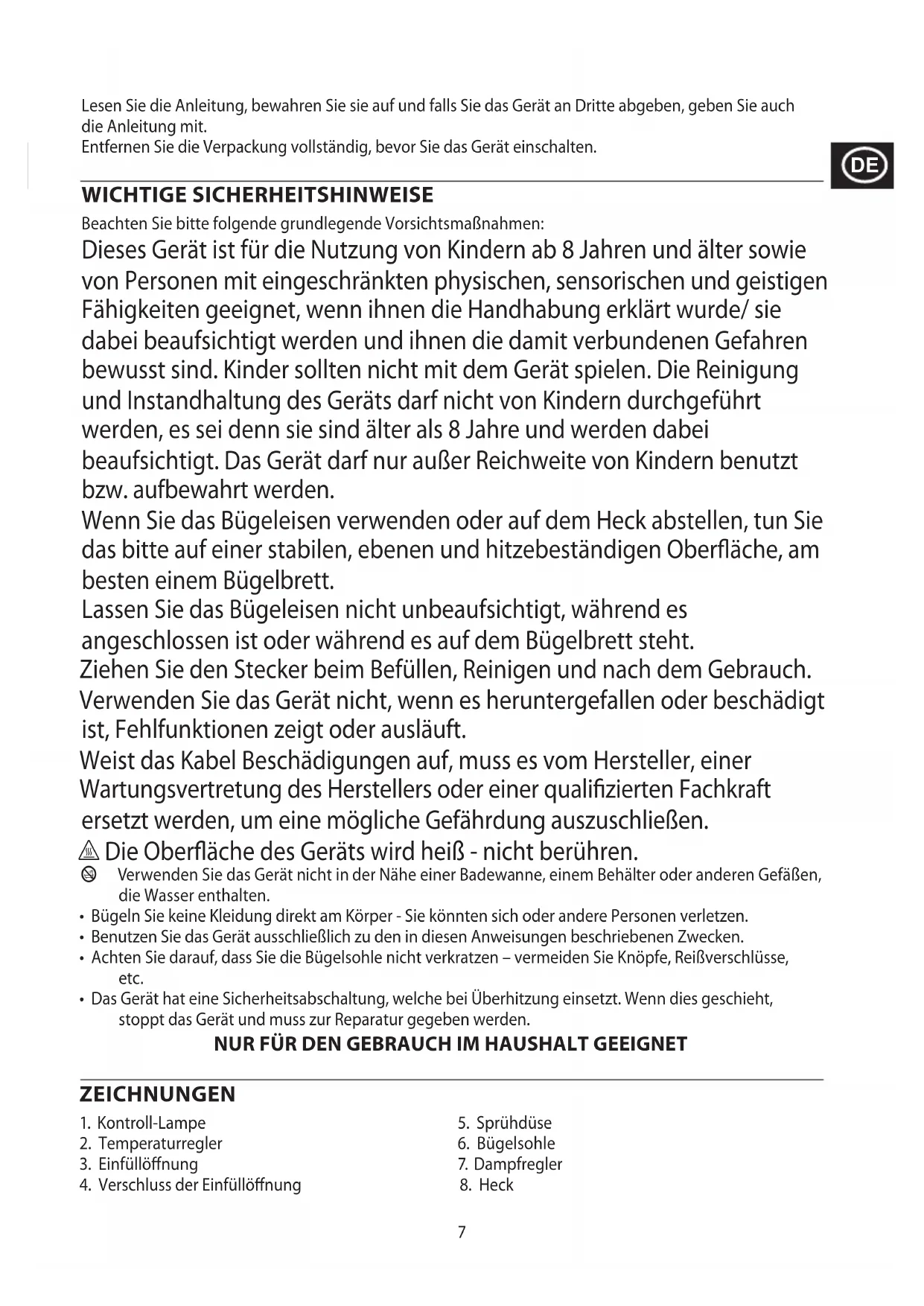 To avoid environmental and health problems due to hazardous substances, appliances and rechargeable and non-rechargeable batteries marked with one of these symbols must not be disposed of with unsorted municipal waste. Always dispose of electrical and electronic products and, where applicable, rechargeable and non-rechargeable batteries, at an appropriate ocial recycling/collection point.7 Lesen Sie die Anleitung, bewahren Sie sie auf und falls Sie das Gerät an Dritte abgeben, geben Sie auch die Anleitung mit. Entfernen Sie die Verpackung vollständig, bevor Sie das Gerät einschalten. WICHTIGE SICHERHEITSHINWEISE Beachten Sie bitte folgende grundlegende Vorsichtsmaßnahmen: Dieses Gerät ist für die Nutzung von Kindern ab 8 Jahren und älter sowie von Personen mit eingeschränkten physischen, sensorischen und geistigen Fähigkeiten geeignet, wenn ihnen die Handhabung erklärt wurde/ sie dabei beaufsichtigt werden und ihnen die damit verbundenen Gefahren bewusst sind. Kinder sollten nicht mit dem Gerät spielen. Die Reinigung und Instandhaltung des Geräts darf nicht von Kindern durchgeführt werden, es sei denn sie sind älter als 8 Jahre und werden dabei beaufsichtigt. Das Gerät darf nur außer Reichweite von Kindern benutzt bzw. aufbewahrt werden. Wenn Sie das Bügeleisen verwenden oder auf dem Heck abstellen, tun Sie das bitte auf einer stabilen, ebenen und hitzebeständigen Oberäche, am besten einem Bügelbrett. Lassen Sie das Bügeleisen nicht unbeaufsichtigt, während es angeschlossen ist oder während es auf dem Bügelbrett steht. Ziehen Sie den Stecker beim Befüllen, Reinigen und nach dem Gebrauch. Verwenden Sie das Gerät nicht, wenn es heruntergefallen oder beschädigt ist, Fehlfunktionen zeigt oder ausläuft. Weist das Kabel Beschädigungen auf, muss es vom Hersteller, einer Wartungsvertretung des Herstellers oder einer qualizierten Fachkraft ersetzt werden, um eine mögliche Gefährdung auszuschließen. h Die Oberäche des Geräts wird heiß - nicht berühren. b Verwenden Sie das Gerät nicht in der Nähe einer Badewanne, einem Behälter oder anderen Gefäßen, die Wasser enthalten.