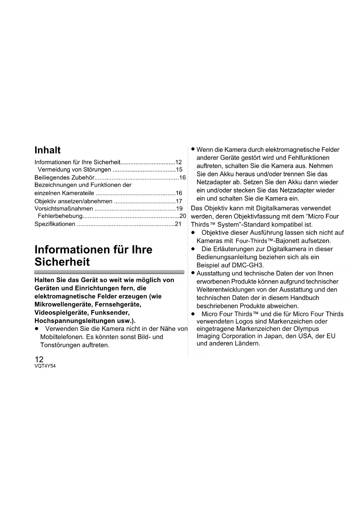 Wenn die Kamera durch elektromagnetische Felder anderer Geräte gestört wird und Fehlfunktionen auftreten, schalten Sie die Kamera aus. Nehmen Sie den Akku heraus und/oder trennen Sie das Netzadapter ab. Setzen Sie den Akku dann wieder ein und/oder stecken Sie das Netzadapter wieder ein und schalten Sie die Kamera ein. Das Objektiv kann mit Digitalkameras verwendet werden, deren Objektivfassung mit dem “Micro Four Thirds ™ System”-Standard kompatibel ist. ≥ Objektive dieser Ausführung lassen sich nicht auf Kameras mit Four-Thirds™-Bajonett aufsetzen. ≥ Die Erläuterungen zur Digitalkamera in dieser Bedienungsanleitung beziehen sich als ein Beispiel auf DMC-GH3.