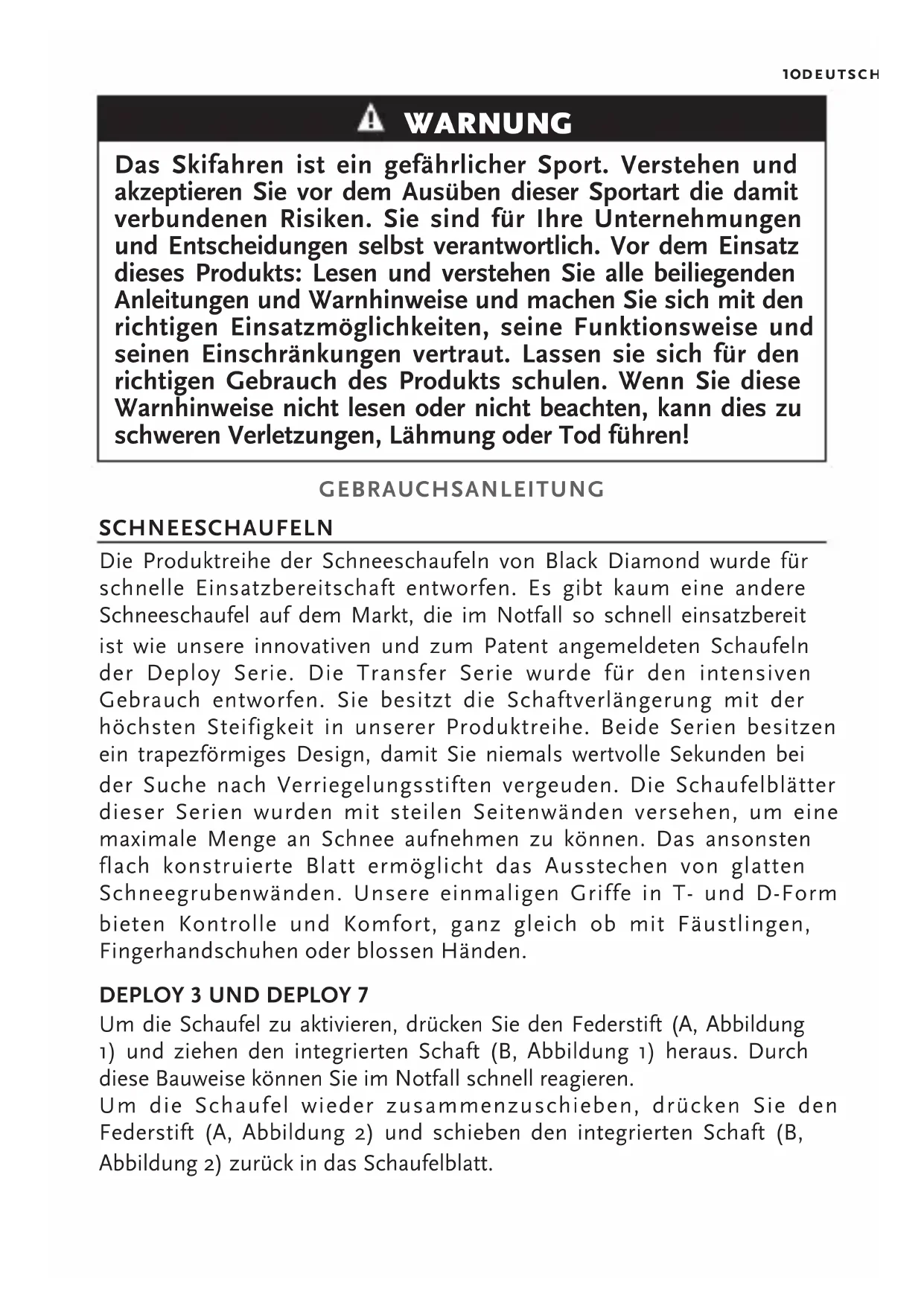 6— 7Gewährleistungsausschluss: Wir bieten keine Garantie gegen normale Abnutzung und Verschleiss unserer Produkte (z. B. jegliche Abnutzung von Skikanten, Schuhsohlen usw.). Bei unerlaubten Veränderungen, unsachgemässer Verwendung und Wartung sowie bei Unfällen, Missbrauch, Vernachlässigung, Beschädigung oder wenn das Produkt zu einem Zweck verwendet wird, für den es nicht entwickelt wurde, ist jegliche Haftung ausgeschlossen. Gemäss dieser Gewährleistung haben Sie bestimmte Rechte, die je nach Land, Staat oder Provinz variieren können. Über die in dieser Gewährleistung ausdrücklich aufgeführte Haftung hinaus übernehmen wir keine Haftung für direkte, indirekte, zufällige oder sonstige Schäden und Folgeschäden, die aus oder aufgrund der Verwendung unserer Produkte entstehen. Diese Gewährleistung gilt anstelle aller anderen Gewährleistungen, ausdrücklich oder stillschweigend, einschliesslich aber nicht begrenzt auf die implizierte Gewährleistung für die Handelsüblichkeit oder die Verwendungsfähigkeit für einen bestimmten Zweck. (Einige Länder, Staaten oder Provinzen lassen den Ausschluss oder die Beschränkung der Haftung für direkte, indirekte, zufällige oder sonstige Schäden und Folgeschäden nicht zu, so dass die obengenannten Ausschlussklauseln für Sie möglicherweise nicht oder nicht in vollem Umfang zutreffen.) BlackDiamondEquipment.com 13italianoSciare è un’attività pericolosa. È utile capire ed accettare i rischi insiti in tale pratica prima di parteciparvi. Sei responsabile delle tue azioni e decisioni. Prima di utilizzare il prodotto, leggere e capire tutte le istruzioni e avvertenze allegate, acquistare dimestichezza con le caratteristiche del prodotto, le sue capacità e limiti; ti consigliamo di esercitarti molto nell’utilizzo di questa attrezzatura. Errori nella lettura e nel rispetto di quanto affermato in questa avvertenza può risultare in grave incidente, paralisi o morte! AVVERTENZE