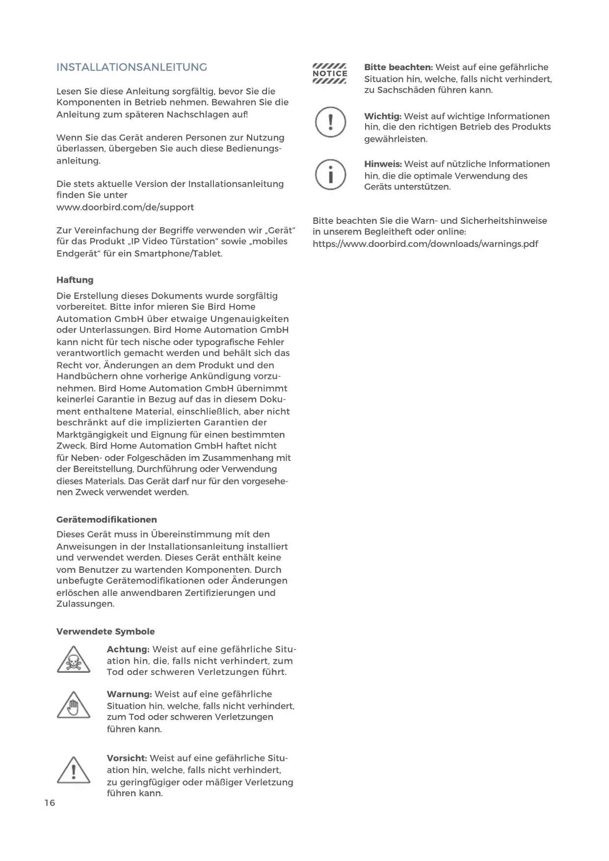 RFID 125 KHz Sensor 24 GHz, can be disabled THIRD-PARTY INTEGRATION (DOORBIRD CONNECT) Partnerintegrations see www.doorbird.com/connect API see www.doorbird.com/api Simultaneous video streams One, for event-based and continuous recording OPTIONAL ACCESSORIES Sold separately see www.doorbird.com/buy16 INSTALLATIONSANLEITUNG Lesen Sie diese Anleitung sorgfältig, bevor Sie die Komponenten in Betrieb nehmen. Bewahren Sie die Anleitung zum späteren Nachschlagen auf! Wenn Sie das Gerät anderen Personen zur Nutzung überlassen, übergeben Sie auch diese Bedienungs- anleitung. Die stets aktuelle Version der Installationsanleitung finden Sie unter www.doorbird.com/de/support Zur Vereinfachung der Begriffe verwenden wir „Gerät“ für das Produkt „IP Video Türstation“ sowie „mobiles Endgerät“ für ein Smartphone/Tablet. Haftung Die Erstellung dieses Dokuments wurde sorgfältig vorbereitet. Bitte infor mieren Sie Bird Home Automation GmbH über etwaige Ungenauigkeiten oder Unterlassungen. Bird Home Automation GmbH kann nicht für tech nische oder typografische Fehler verantwortlich gemacht werden und behält sich das Recht vor, Änderungen an dem Produkt und den Handbüchern ohne vorherige Ankündigung vorzu- nehmen. Bird Home Automation GmbH übernimmt keinerlei Garantie in Bezug auf das in diesem Doku- ment enthaltene Material, einschließlich, aber nicht beschränkt auf die implizierten Garantien der Marktgängigkeit und Eignung für einen bestimmten Zweck. Bird Home Automation GmbH haftet nicht für Neben- oder Folgeschäden im Zusammenhang mit der Bereitstellung, Durchführung oder Verwendung dieses Materials. Das Gerät darf nur für den vorgesehe- nen Zweck verwendet werden. Gerätemodifikationen Dieses Gerät muss in Übereinstimmung mit den Anweisungen in der Installationsanleitung installiert und verwendet werden. Dieses Gerät enthält keine vom Benutzer zu wartenden Komponenten. Durch unbefugte Gerätemodifikationen oder Änderungen erlöschen alle anwendbaren Zertifizierungen und Zulassungen. Verwendete Symbole Achtung: Weist auf eine gefährliche Situ- ation hin, die, falls nicht verhindert, zum Tod oder schweren Verletzungen führt. Warnung: Weist auf eine gefährliche Situation hin, welche, falls nicht verhindert, zum Tod oder schweren Verletzungen führen kann. Bitte beachten: Weist auf eine gefährliche Situation hin, welche, falls nicht verhindert, zu Sachschäden führen kann. Hinweis: Weist auf nützliche Informationen hin, die die optimale Verwendung des Geräts unterstützen. NOTICE Wichtig: Weist auf wichtige Informationen hin, die den richtigen Betrieb des Produkts gewährleisten. Vorsicht: Weist auf eine gefährliche Situ- ation hin, welche, falls nicht verhindert, zu geringfügiger oder mäßiger Verletzung führen kann. Bitte beachten Sie die Warn- und Sicherheitshinweise in unserem Begleitheft oder online: https://www.doorbird.com/downloads/warnings.pdf17 DEUTSCH
