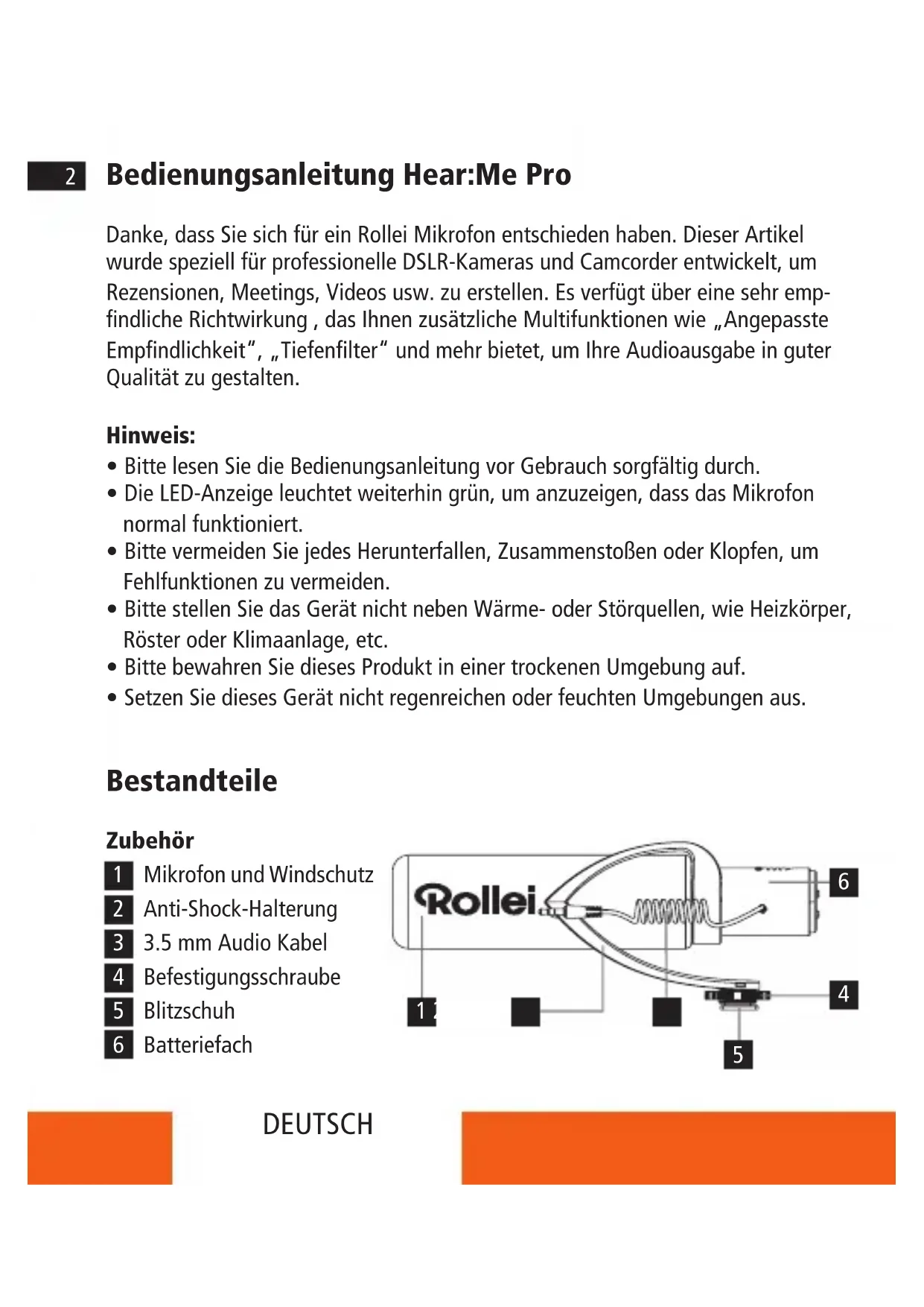PORTUGUESE | DUTCH2 Bedienungsanleitung Hear:Me Pro Danke, dass Sie sich für ein Rollei Mikrofon entschieden haben. Dieser Artikel wurde speziell für professionelle DSLR-Kameras und Camcorder entwickelt, um Rezensionen, Meetings, Videos usw. zu erstellen. Es verfügt über eine sehr emp- findliche Richtwirkung , das Ihnen zusätzliche Multifunktionen wie „Angepasste Empfindlichkeit“, „Tiefenfilter“ und mehr bietet, um Ihre Audioausgabe in guter Qualität zu gestalten. Hinweis: