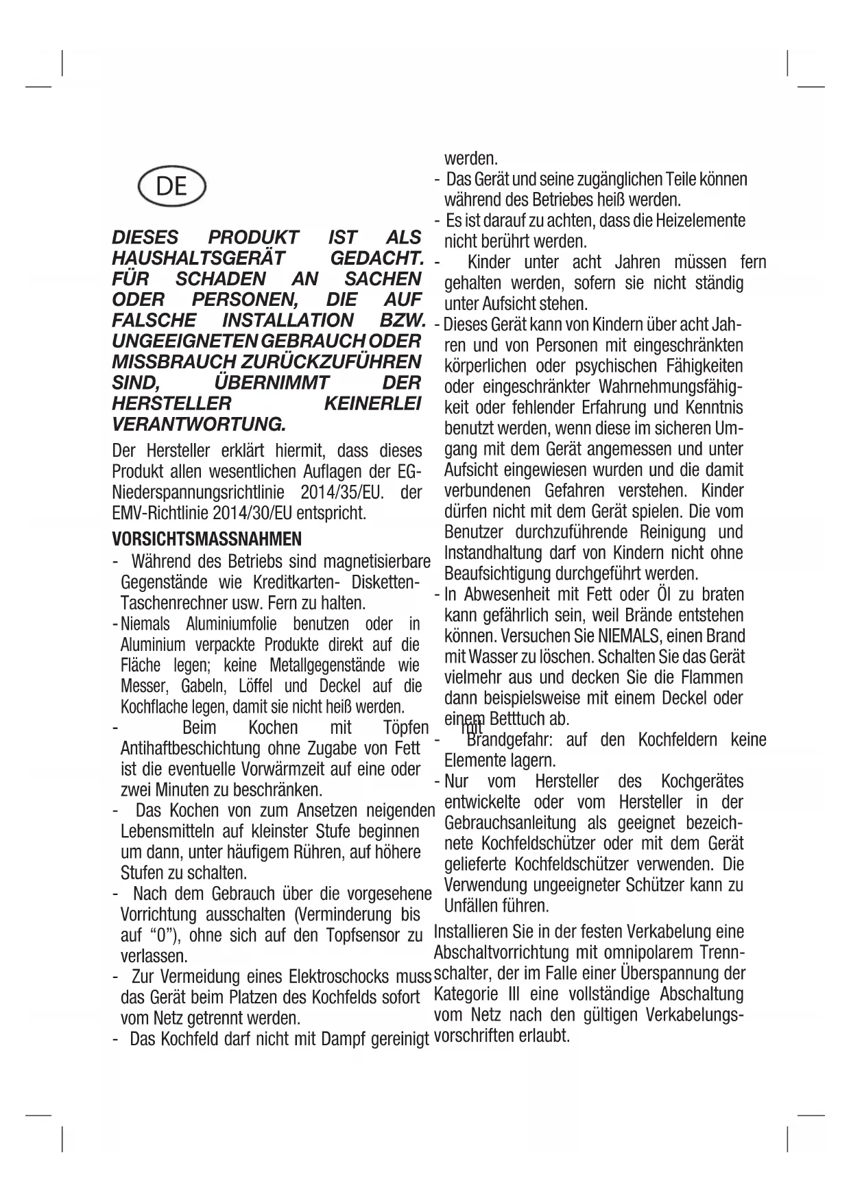 Niemals Aluminiumfolie benutzen oder in Aluminium verpackte Produkte direkt auf die Fläche legen; keine Metallgegenstände wie Messer, Gabeln, Löffel und Deckel auf die Kochflache legen, damit sie nicht heiß werden. - Beim Kochen mit Töpfen mit Antihaftbeschichtung ohne Zugabe von Fett ist die eventuelle Vorwärmzeit auf eine oder zwei Minuten zu beschränken. - Das Kochen von zum Ansetzen neigenden Lebensmitteln auf kleinster Stufe beginnen um dann, unter häufigem Rühren, auf höhere Stufen zu schalten. - Nach dem Gebrauch über die vorgesehene Vorrichtung ausschalten (Verminderung bis auf “0”), ohne sich auf den Topfsensor zu verlassen. - Zur Vermeidung eines Elektroschocks muss das Gerät beim Platzen des Kochfelds sofort vom Netz getrennt werden. - Das Kochfeld darf nicht mit Dampf gereinigt werden. - Das Gerät und seine zugänglichen Teile können während des Betriebes heiß werden. - Es ist darauf zu achten, dass die Heizelemente nicht berührt werden. - Kinder unter acht Jahren müssen fern gehalten werden, sofern sie nicht ständig unter Aufsicht stehen. - Dieses Gerät kann von Kindern über acht Jah- ren und von Personen mit eingeschränkten körperlichen oder psychischen Fähigkeiten oder eingeschränkter Wahrnehmungsfähig- keit oder fehlender Erfahrung und Kenntnis benutzt werden, wenn diese im sicheren Um- gang mit dem Gerät angemessen und unter Aufsicht eingewiesen wurden und die damit verbundenen Gefahren verstehen. Kinder dürfen nicht mit dem Gerät spielen. Die vom Benutzer durchzuführende Reinigung und Instandhaltung darf von Kindern nicht ohne Beaufsichtigung durchgeführt werden. - In Abwesenheit mit Fett oder Öl zu braten kann gefährlich sein, weil Brände entstehen können. Versuchen Sie NIEMALS, einen Brand mit Wasser zu löschen. Schalten Sie das Gerät vielmehr aus und decken Sie die Flammen dann beispielsweise mit einem Deckel oder einem Betttuch ab. - Brandgefahr: auf den Kochfeldern keine Elemente lagern. - Nur vom Hersteller des Kochgerätes entwickelte oder vom Hersteller in der Gebrauchsanleitung als geeignet bezeich- nete Kochfeldschützer oder mit dem Gerät gelieferte Kochfeldschützer verwenden. Die Verwendung ungeeigneter Schützer kann zu Unfällen führen. Installieren Sie in der festen Verkabelung eine Abschaltvorrichtung mit omnipolarem Trenn- schalter, der im Falle einer Überspannung der Kategorie III eine vollständige Abschaltung vom Netz nach den gültigen Verkabelungs- vorschriften erlaubt. DEDie Steckdose oder der allpolige Schalter müssen bei dem installierten Apparat leicht zu erreichen sein. Dieses Gerät ist nicht für den Gebrauch mit einer externen Zeitschaltuhr oder einem gesonderten Fernbedienungssystem vorgesehen. Der Hersteller lehnt jede Verantwortung ab falls oben genannte Ausführungen und die üblichen Unfallnormen nicht eingehalten werden. Falls das Netzkabel beschädigt ist, muss es durch den Hersteller oder seinen technischen Kundendienst oder in jedem Fall durch eine entsprechend qualizierte Fachkraft ersetzt werden, um jedes Risiko auszuschließen. ARBEITSWEISE (Abb. 1) Es beruht auf den elektromagnetischen Eigenschaften des Großteils der Kochgefässe. Der Stromkreis steuert den Betrieb der Drosselspule (Induktor), die ein Magnetfeld aufbaut. Die Wärme wird vom Topf selbst an die Speise übertragen. Der Kochvorgang vollzieht sich wie unten beschrieben. - minimaler Verlust (hoher Wirkungsgrad) - das Wegnehmen des Topfes (es genügt das Anheben) führt zur Unterbrechung des Systems. - das elektronische System erlaubt größte Flexibilität und Genauigkeit in der Regulierung. (Abb. 1) 1 Gefäße 2 Induktionsstrom 3 Magnetfeld 4 Induktor 5 Stromkreis 6 Stromzufuhr Anweisungen für den Benutzer (Abb. 2) 1 Einschalten/Ausschalten ON/OFF 2 Weniger – 3 Mehr + 4 Anzeige Kochzone 5 Display Leistungsstufe 6 Anzeigelampe programmierte Zone