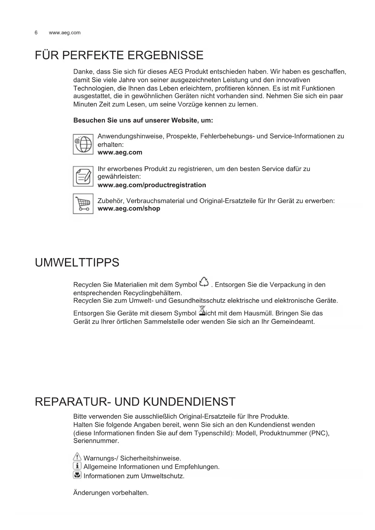 Danke, dass Sie sich für dieses AEG Produkt entschieden haben. Wir haben es geschaffen, damit Sie viele Jahre von seiner ausgezeichneten Leistung und den innovativen Technologien, die Ihnen das Leben erleichtern, profitieren können. Es ist mit Funktionen ausgestattet, die in gewöhnlichen Geräten nicht vorhanden sind. Nehmen Sie sich ein paar Minuten Zeit zum Lesen, um seine Vorzüge kennen zu lernen. Besuchen Sie uns auf unserer Website, um: Anwendungshinweise, Prospekte, Fehlerbehebungs- und Service-Informationen zu erhalten: www.aeg.com Ihr erworbenes Produkt zu registrieren, um den besten Service dafür zu gewährleisten: www.aeg.com/productregistration Zubehör, Verbrauchsmaterial und Original-Ersatzteile für Ihr Gerät zu erwerben: www.aeg.com/shop UMWELTTIPPS Recyclen Sie Materialien mit dem Symbol . Entsorgen Sie die Verpackung in den entsprechenden Recyclingbehältern. Recyclen Sie zum Umwelt- und Gesundheitsschutz elektrische und elektronische Geräte. Entsorgen Sie Geräte mit diesem Symbol nicht mit dem Hausmüll. Bringen Sie das Gerät zu Ihrer örtlichen Sammelstelle oder wenden Sie sich an Ihr Gemeindeamt.