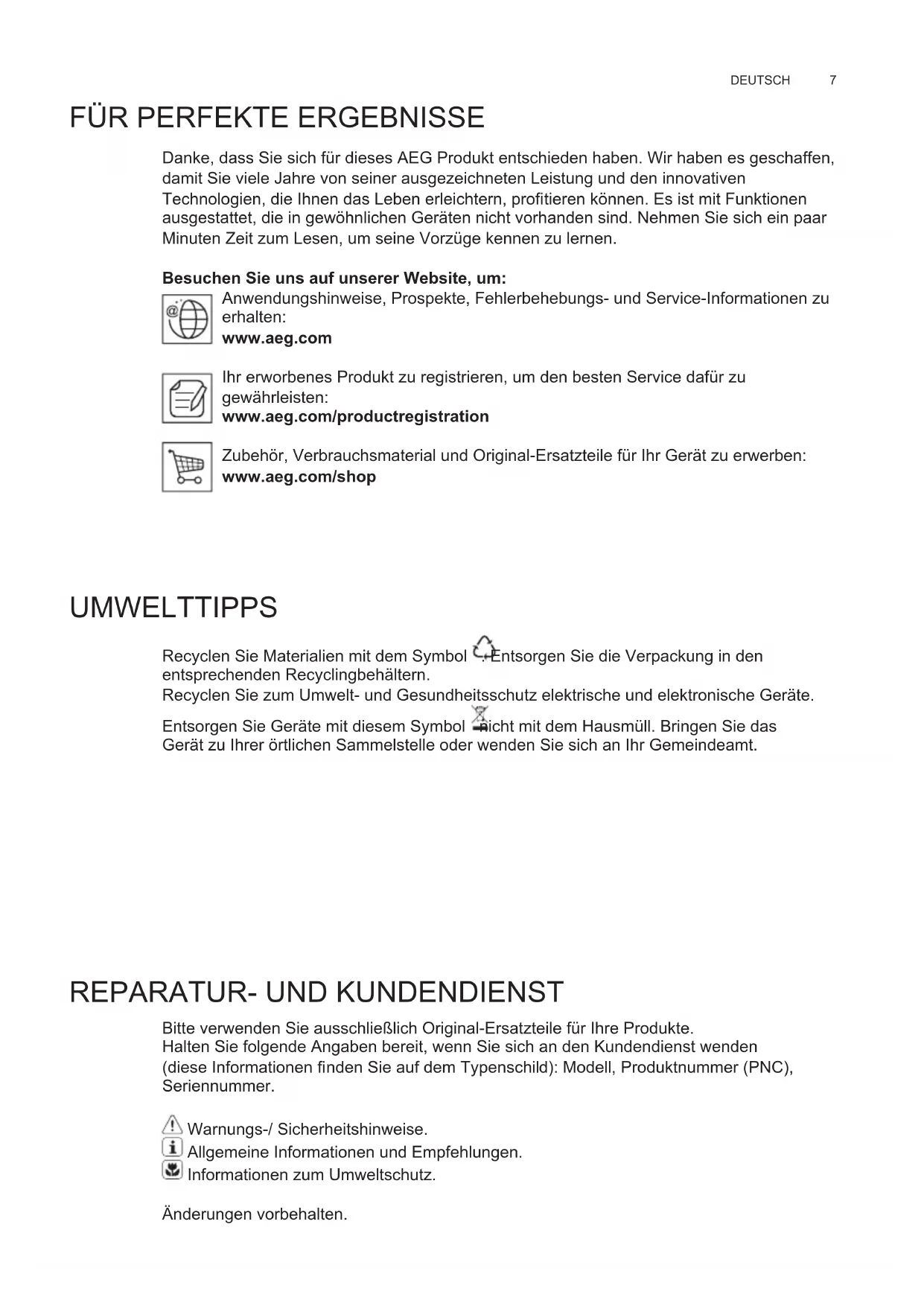Danke, dass Sie sich für dieses AEG Produkt entschieden haben. Wir haben es geschaffen, damit Sie viele Jahre von seiner ausgezeichneten Leistung und den innovativen Technologien, die Ihnen das Leben erleichtern, profi tieren können. Es ist mit Funktionen ausgestattet, die in gewöhnlichen Geräten nicht vorhanden sind. Nehmen Sie sich ein paar Minuten Zeit zum Lesen, um seine Vorzüge kennen zu lernen. Besuchen Sie uns auf unserer Website, um: Anwendungshinweise, Prospekte, Fehlerbehebungs- und Service-Informationen zu erhalten: www.aeg.com Ihr erworbenes Produkt zu registrieren, um den besten Service dafür zu gewährleisten: www.aeg.com/productregistration Zubehör, Verbrauchsmaterial und Original-Ersatzteile für Ihr Gerät zu erwerben: www.aeg.com/shop UMWELTTIPPS Recyclen Sie Materialien mit dem Symbol . Entsorgen Sie die Verpackung in den entsprechenden Recyclingbehältern. Recyclen Sie zum Umwelt- und Gesundheitsschutz elektrische und elektronische Geräte. Entsorgen Sie Geräte mit diesem Symbol nicht mit dem Hausmüll. Bringen Sie das Gerät zu Ihrer örtlichen Sammelstelle oder wenden Sie sich an Ihr Gemeindeamt.