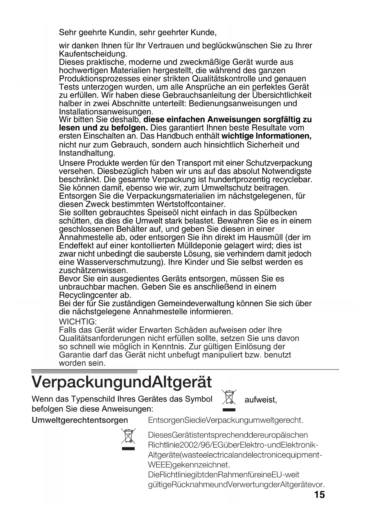 ...if none of the electrical system works? -Faulty fuse. -Check the fuse in the main fuse box and -The automatic circuit breaker or mains differential has been triggered. -Check to see if the circuit breaker or a differential has been triggered in the mains ...if the electric ignition system does not work? -There may be food or cleaning product particles between the spark plugs and the burners. -The burners are wet. -Dry the burner covers and spark plugs carefully. -Check that the covers have been put in the proper position. -The covers on the burners are not in the right position. ...if the flame on the burners is not evenly distributed? -The burner components have not been assembled properly. -The gas outlets on the burners are dirty. -Put the components in their correct positions. -Clean the gas outlets on the burners. ...if the gas flow does not seem normal or there is no gas flow at all? -The gas flow has been cut at an intermediate stopcock. -If the gas is supplied from a gas bottle, it may be empty. - Open any intermediate stopcocks. -Replace the gas bottle with a full one. ...if the kitchen smells of gas? -One of the valves has been left open. -Possible leak on the gas bottle coupling. -Check to see if a valve has been left open. -Check that the coupling on the gas bottle is in order. What´s wrong Possible cause Solution -The gap between the spark plug and the burner needs to be cleaned carefully. It is not always necessary to call the Service Centre. In some cases, you may be able to solve the problem yourself. This table contains some useful information. Important information: Only authorised personnel from our Service Centre are qualified to work on the main gas and electric systems. ...if the safety devices on the different burners do not work? -The control knob has not been kept pressed in for long enough. -The outlets on the burners are dirty. -Once ignited, keep the control knob pressed in for a few seconds. -Clean the gas outlets on the burners. replace it if it is faulty. supply box.Conditions of warranty The conditions of warranty are those set out by our company's representatives in the country where you purchased your appliance. The salesperson that sold you the appliance will be only too pleased to inform you as to the details of these conditions. Proof of purchase must be produced when making any kind of claim against the warranty. The manufacturer reserves the right to modify these conditions. Should you need to contact our Service Centre, please quote the following information: E - NR FD These indications appear on your appliance's characteristics plate on the bottom of your appliance. 14Sehr geehrte Kundin, sehr geehrter Kunde, wir danken Ihnen für Ihr Vertrauen und beglückwünschen Sie zu Ihrer Kaufentscheidung. Dieses praktische, moderne und zweckmäßige Gerät wurde aus hochwertigen Materialien hergestellt, die während des ganzen Produktionsprozesses einer strikten Qualitätskontrolle und genauen Tests unterzogen wurden, um alle Ansprüche an ein perfektes Gerät zu erfüllen. Wir haben diese Gebrauchsanleitung der Übersichtlichkeit halber in zwei Abschnitte unterteilt: Bedienungsanweisungen und Installationsanweisungen. Wir bitten Sie deshalb, diese einfachen Anweisungen sorgfältig zu lesen und zu befolgen. Dies garantiert Ihnen beste Resultate vom ersten Einschalten an. Das Handbuch enthält wichtige Informationen, nicht nur zum Gebrauch, sondern auch hinsichtlich Sicherheit und Instandhaltung. Unsere Produkte werden für den Transport mit einer Schutzverpackung versehen. Diesbezüglich haben wir uns auf das absolut Notwendigste beschränkt. Die gesamte Verpackung ist hundertprozentig recyclebar. Entsorgen Sie die Verpackungsmaterialien im nächstgelegenen, für diesen Zweck bestimmten Wertstoffcontainer. Sie sollten gebrauchtes Speiseöl nicht einfach in das Spülbecken schütten, da dies die Umwelt stark belastet. Bewahren Sie es in einem geschlossenen Behälter auf, und geben Sie diesen in einer Annahmestelle ab, oder entsorgen Sie ihn direkt im Hausmüll (der im zwar nicht unbedingt die sauberste Lösung, sie verhindern damit jedoch eine Wasserverschmutzung). Ihre Kinder und Sie selbst werden es Bevor Sie ein ausgedientes Geräts entsorgen, müssen Sie es unbrauchbar machen. Geben Sie es anschließend in einem Recyclingcenter ab. Bei der für Sie zuständigen Gemeindeverwaltung können Sie sich über die nächstgelegene Annahmestelle informieren.