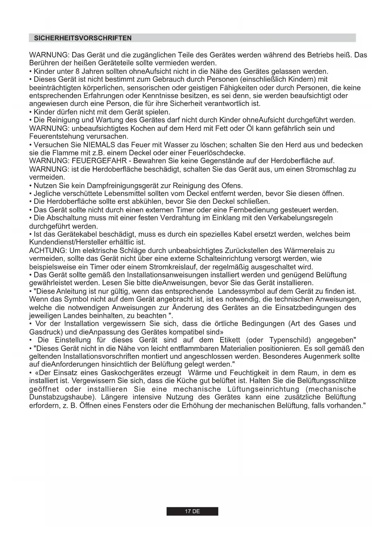 - Die Reinigung und Wartung des Gerätes darf nicht durch Kinder ohneAufsicht durchgeführt werden. WARNUNG: unbeaufsichtigtes Kochen auf dem Herd mit Fett oder Öl kann gefährlich sein und Feuerentstehung verursachen.
