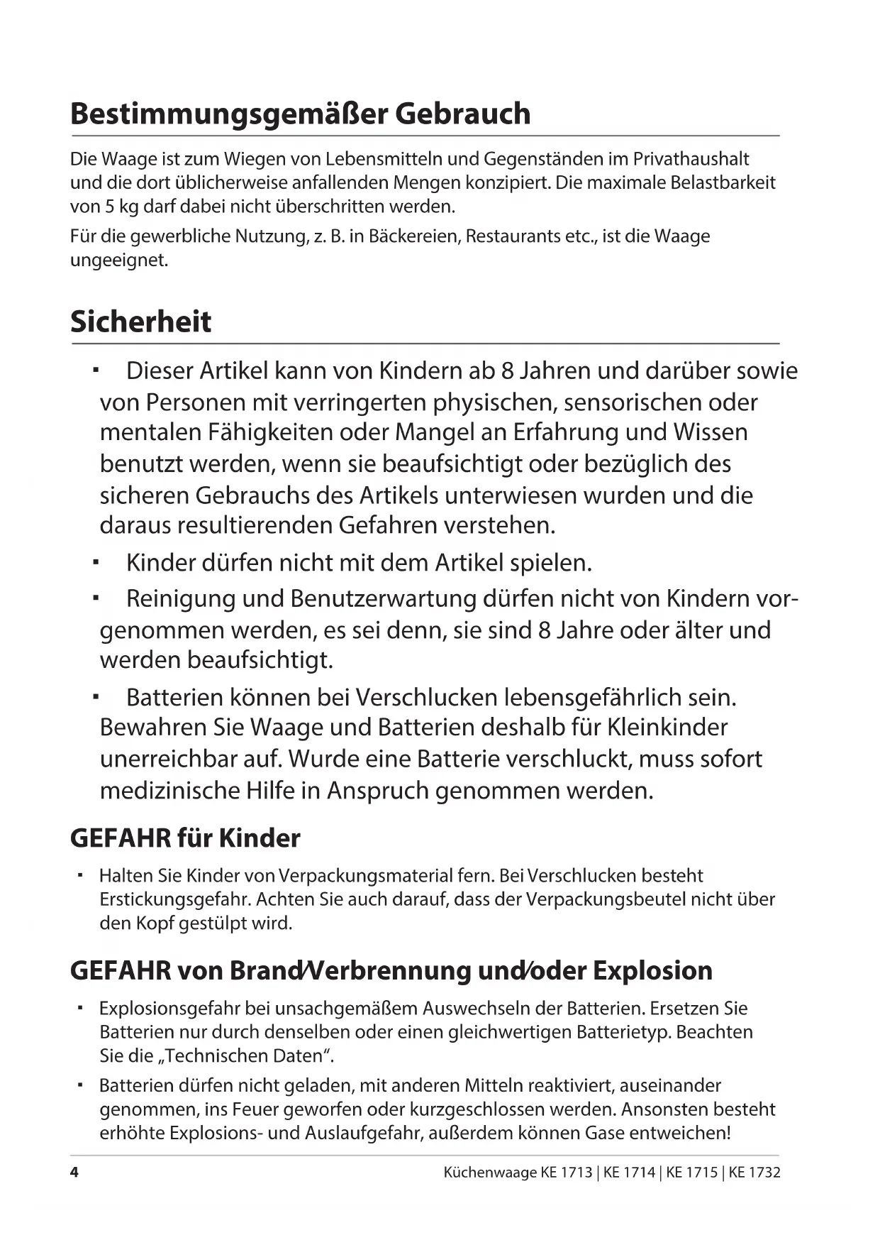 Küchenwaage KE 1713 | KE 1714 | KE 1715 | KE 1732 Bestimmungsgemäßer Gebrauch Die Waage ist zum Wiegen von Lebensmitteln und Gegenständen im Privathaushalt und die dort üblicherweise anfallenden Mengen konzipiert. Die maximale Belastbarkeit von 5 kg darf dabei nicht überschritten werden. Für die gewerbliche Nutzung, z. B. in Bäckereien, Restaurants etc., ist die Waage ungeeignet. Sicherheit Dieser Artikel kann von Kindern ab 8 Jahren und darüber sowie von Personen mit verringerten physischen, sensorischen oder mentalen Fähigkeiten oder Mangel an Erfahrung und Wissen benutzt werden, wenn sie beaufsichtigt oder bezüglich des sicheren Gebrauchs des Artikels unterwiesen wurden und die daraus resultierenden Gefahren verstehen. Kinder dürfen nicht mit dem Artikel spielen. Reinigung und Benutzerwartung dürfen nicht von Kindern vor- genommen werden, es sei denn, sie sind 8 Jahre oder älter und werden beaufsichtigt. Batterien können bei Verschlucken lebensgefährlich sein. Bewahren Sie Waage und Batterien deshalb für Kleinkinder unerreichbar auf. Wurde eine Batterie verschluckt, muss sofort medizinische Hilfe in Anspruch genommen werden. GEFAHR für Kinder Halten Sie Kinder von Verpackungsmaterial fern. Bei Verschlucken besteht Erstickungsgefahr. Achten Sie auch darauf, dass der Verpackungsbeutel nicht über den Kopf gestülpt wird. GEFAHR von Brand/Verbrennung und/oder Explosion Explosionsgefahr bei unsachgemäßem Auswechseln der Batterien. Ersetzen Sie Batterien nur durch denselben oder einen gleichwertigen Batterietyp. Beachten Sie die „Technischen Daten“. Batterien dürfen nicht geladen, mit anderen Mitteln reaktiviert, auseinander genommen, ins Feuer geworfen oder kurzgeschlossen werden. Ansonsten besteht erhöhte Explosions- und Auslaufgefahr, außerdem können Gase entweichen! Druckbuch CLEO.indb 4 21.03.2017 08:53:37Sicherheit