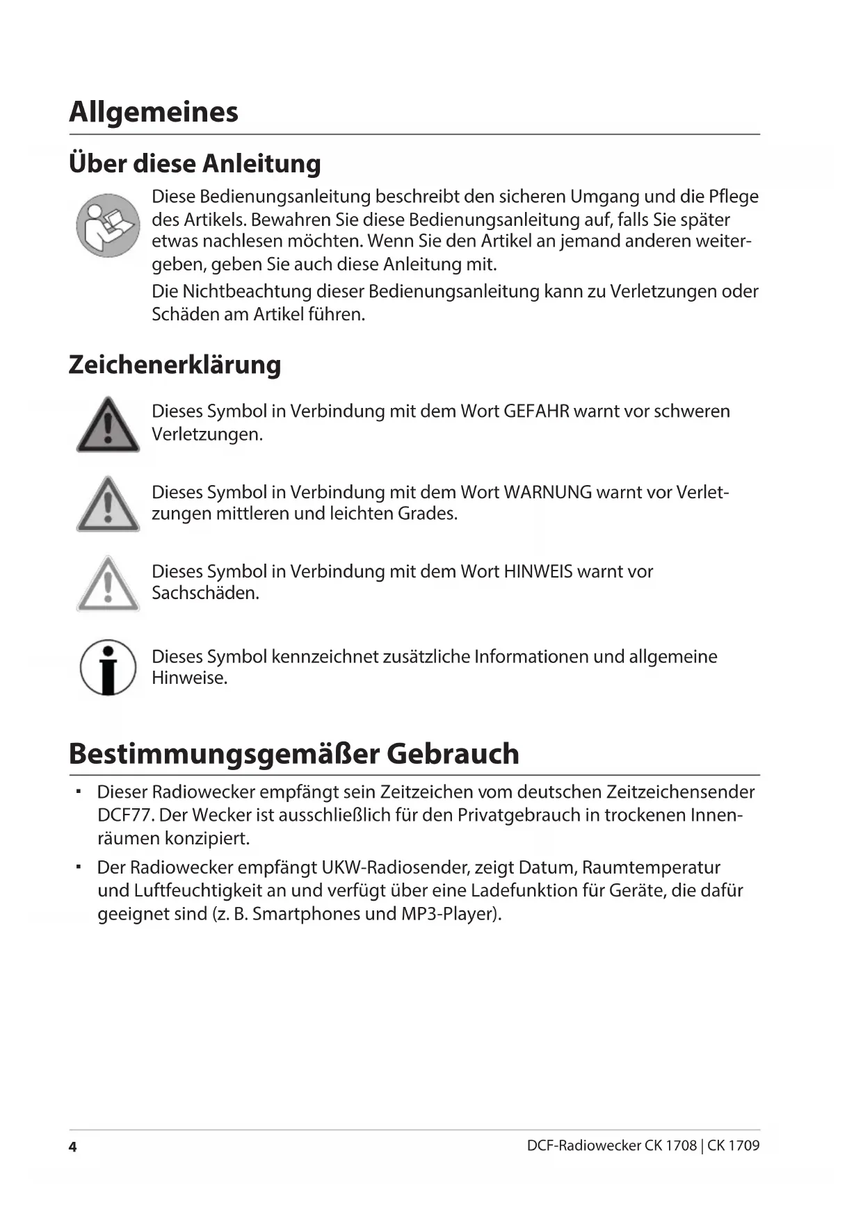 DCF-Radiowecker CK 1708 | CK 1709 Allgemeines Über diese Anleitung Diese Bedienungsanleitung beschreibt den sicheren Umgang und die Pflege des Artikels. Bewahren Sie diese Bedienungsanleitung auf, falls Sie später etwas nachlesen möchten. Wenn Sie den Artikel an jemand anderen weiter- geben, geben Sie auch diese Anleitung mit. Die Nichtbeachtung dieser Bedienungsanleitung kann zu Verletzungen oder Schäden am Artikel führen. Zeichenerklärung Dieses Symbol in Verbindung mit dem Wort GEFAHR warnt vor schweren Verletzungen. Dieses Symbol in Verbindung mit dem Wort WARNUNG warnt vor Verlet- zungen mittleren und leichten Grades. Dieses Symbol in Verbindung mit dem Wort HINWEIS warnt vor Sachschäden. Dieses Symbol kennzeichnet zusätzliche Informationen und allgemeine Hinweise. Bestimmungsgemäßer Gebrauch Dieser Radiowecker empfängt sein Zeitzeichen vom deutschen Zeitzeichensender DCF77. Der Wecker ist ausschließlich für den Privatgebrauch in trockenen Innen- räumen konzipiert. Der Radiowecker empfängt UKW-Radiosender, zeigt Datum, Raumtemperatur und Luftfeuchtigkeit an und verfügt über eine Ladefunktion für Geräte, die dafür geeignet sind (z.B. Smartphones und MP3-Player). Druckbuch CK 1708_1709.indb 4 24.10.2017 12:56:10Sicherheit