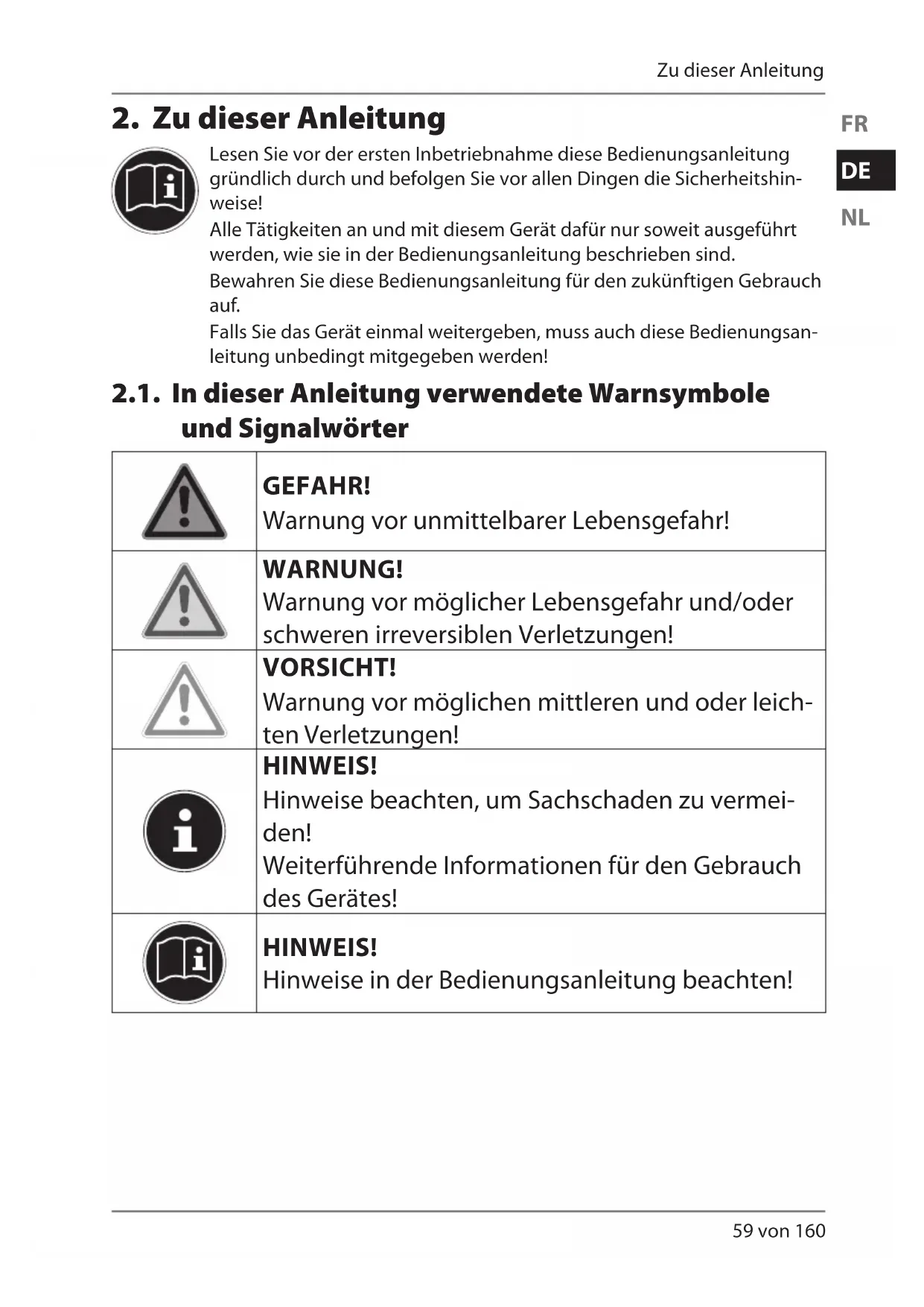- Beachten Sie alle Informationen in dieser Bedienungsanleitung, insbesondere die Sicherheitshinweise. Jede andere Bedienung gilt als nicht bestimmungsge- mäß und kann zu Personen- oder Sachschäden führen.