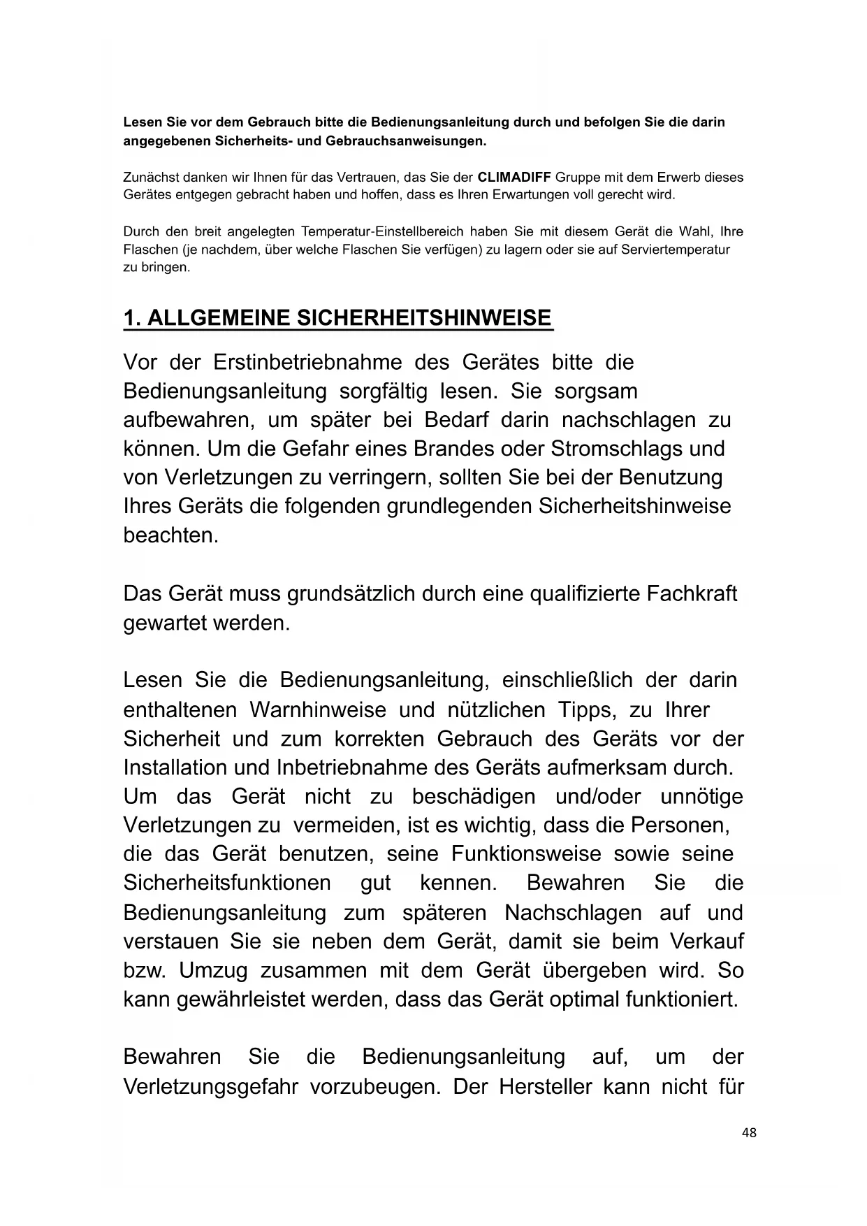As we continuously improve our products for the benefit of our customers, we reserve the right to modify technical characteristics without notice. Warranties for CLIMADIFF brand products are offered exclusively by selected retailers. No part of these instructions may be considered as a supplementary guarantee. FRIO ENTREPRISE cannot be held liable for errors or technical or editorial omissions in this document. Non-binding document.4748 Lesen Sie vor dem Gebrauch bitte die Bedienungsanleitung durch und befolgen Sie die darin angegebenen Sicherheits- und Gebrauchsanweisungen. Zunächst danken wir Ihnen für das Vertrauen, das Sie der CLIMADIFF Gruppe mit dem Erwerb dieses Gerätes entgegen gebracht haben und hoffen, dass es Ihren Erwartungen voll gerecht wird. Durch den breit angelegten Temperatur-Einstellbereich haben Sie mit diesem Gerät die Wahl, Ihre Flaschen (je nachdem, über welche Flaschen Sie verfügen) zu lagern oder sie auf Serviertemperatur zu bringen.
