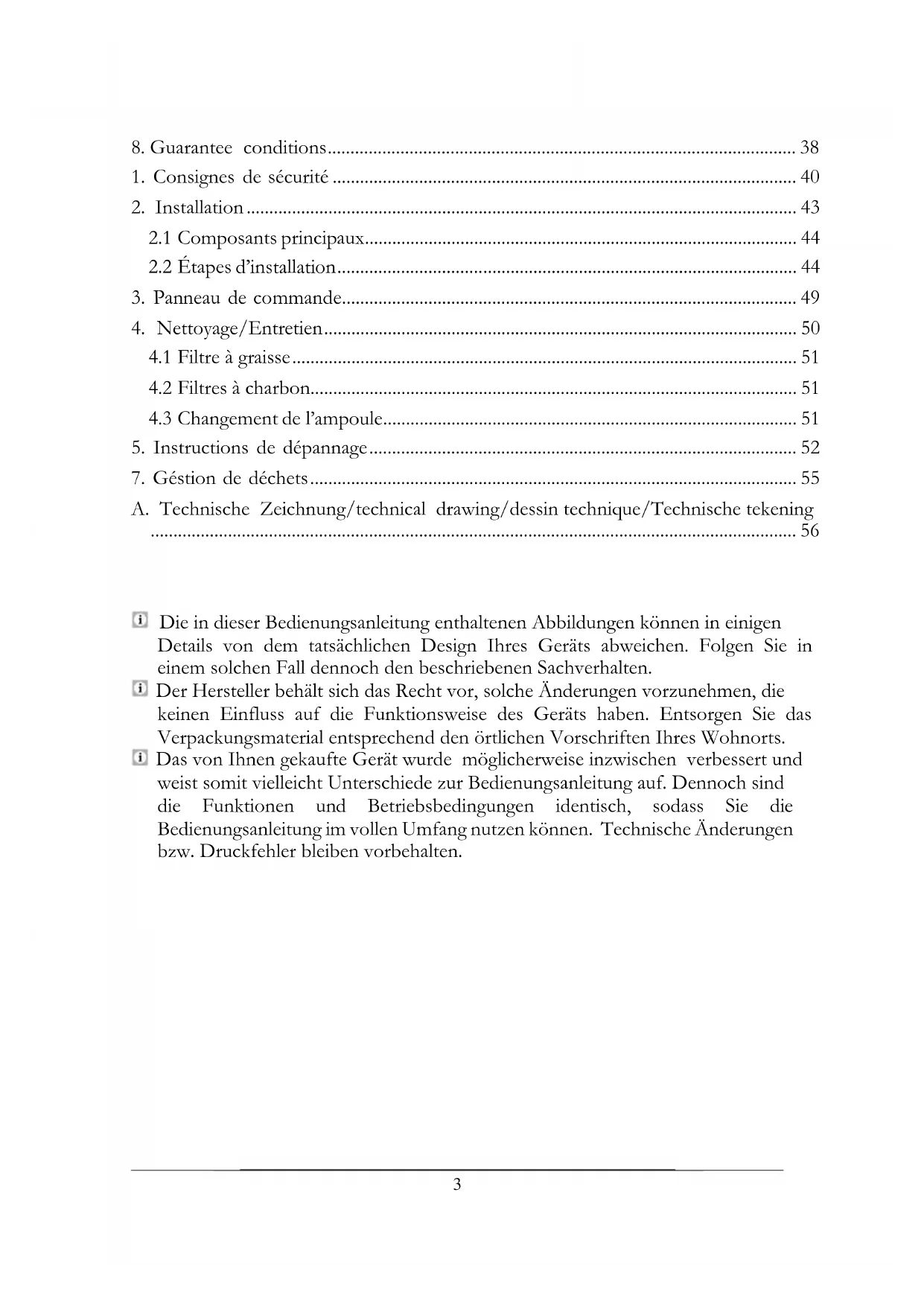 Die in dieser Bedienungsanleitung enthaltenen Abbildungen können in einigen Details von dem tatsächlichen Design Ihres Geräts abweichen. Folgen Sie in einem solchen Fall dennoch den beschriebenen Sachverhalten. Der Hersteller behält sich das Recht vor, solche Änderungen vorzunehmen, die keinen Einfluss auf die Funktionsweise des Geräts haben. Entsorgen Sie das Verpackungsmaterial entsprechend den örtlichen Vorschriften Ihres Wohnorts. Das von Ihnen gekaufte Gerät wurde möglicherweise inzwischen verbessert und weist somit vielleicht Unterschiede zur Bedienungsanleitung auf. Dennoch sind die Funktionen und Betriebsbedingungen identisch, sodass Sie die Bedienungsanleitung im vollen Umfang nutzen können. Technische Änderungen bzw. Druckfehler bleiben vorbehalten.4