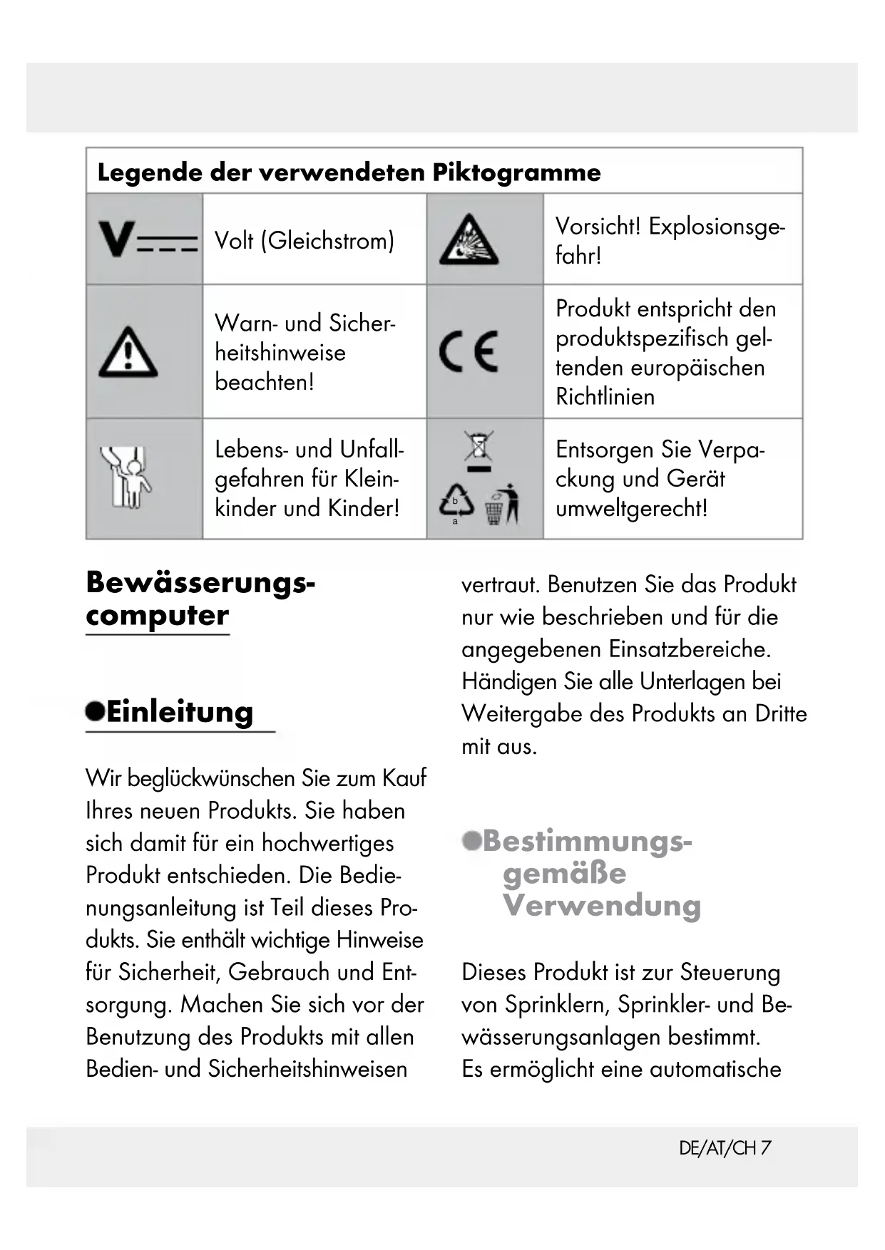 Beachten Sie die Kenn- zeichnung der Verpa- ckungsmaterialien bei der Abfalltrennung, diese sind ge- kennzeichnet mit Abkürzungen (a) und Nummern (b) mit folgender Bedeutung: 1–7: Kunststoffe / 20–22: Papier und Pappe / 80– 98: Verbundstoffe. Das Produkt und die Verpackungsmateria- lien sind recycelbar, entsorgen Sie diese getrennt für eine bessere Abfallbehandlung. Das Triman-Logo gilt nur für Frank- reich. Möglichkeiten zur Ent- sorgung des ausgedien- ten Produkts erfahrenDE/AT/CH 27 Sie bei Ihrer Gemeinde- oder Stadtverwaltung. Werfen Sie Ihr Produkt, wenn es ausgedient hat, im Interesse des Umwelt- schutzes nicht in den Hausmüll, sondern führen Sie es einer fach- gerechten Entsorgung zu. Über Sammelstellen und deren Öffnungs- zeiten können Sie sich bei Ihrer zu- ständigen Verwaltung informieren. Defekte oder verbrauchte Batte- rien / Akkus müssen gemäß Richt- linie 2006/66/EG und deren Änderungen recycelt werden. Geben Sie Batterien / Akkus und / oder das Produkt über die angebo- tenen Sammeleinrichtungen zurück. Umweltschäden durch falsche Entsorgung der Batterien / Akkus! Batterien / Akkus dürfen nicht über den Hausmüll entsorgt werden. Sie können giftige Schwermetalle enthalten und unterliegen der Sondermüllbehandlung. Die che- mischen Symbole der Schwerme- talle sind wie folgt: Cd = Cadmium, Hg = Quecksilber, Pb = Blei. Geben Sie deshalb verbrauchte Batterien / Akkus bei einer kommunalen Sammelstelle ab. Garantie Das Produkt wurde nach strengen Qualitätsrichtlinien sorgfältig pro- duziert und vor Anlieferung ge- wissenhaft geprüft. Im Falle von Mängeln dieses Produkts stehen Ihnen gegen den Verkäufer des Produkts gesetzliche Rechte zu. Diese gesetzlichen Rechte werden durch unsere im Folgenden dar- gestellte Garantie nicht einge- schränkt. Sie erhalten auf dieses Produkt 3 Jahre Garantie ab Kaufdatum. Die Garantiefrist beginnt mit dem Kaufdatum. Bitte bewahren Sie den Original-Kassenbon gut auf. Diese Unterlage wird als Nach- weis für den Kauf benötigt.28 DE/AT/CH Tritt innerhalb von 3 Jahren ab dem Kaufdatum dieses Produkts ein Material- oder Fabrikationsfehler auf, wird das Produkt von uns – nach unserer Wahl – für Sie kostenlos repariert oder ersetzt. Diese Ga- rantie verfällt, wenn das Produkt beschädigt, nicht sachgemäß be- nutzt oder gewartet wurde. Die Garantieleistung gilt für Mate- rial- oder Fabrikationsfehler. Diese Garantie erstreckt sich nicht auf Produktteile, die normaler Abnut- zung ausgesetzt sind (z. B. Batte- rien) und daher als Verschleißteile angesehen werden können oder Beschädigungen an zerbrechlichen Teilen, z. B. Schalter, Akkus oder die aus Glas gefertigt sind.GB/IE 29 List of pictograms used ..............................................Page 31 Introduction .........................................................................Page 31 Intended use ..............................................................................Page 31 Scope of delivery ......................................................................Page 32 Technical data ...........................................................................Page 32 Parts description ........................................................................Page 33 Display indicators ......................................................................Page 33 Safety .......................................................................................Page 34 Safety instructions ......................................................................Page 34 Safety instructions for batteries / rechargeable batteries .......Page 36 Inserting / replacing batteries ..............................Page 39 Initial use ...............................................................................Page 39 Operation .............................................................................Page 40 Putting the product into operation ............................................Page 41 Setting current time and day of week ......................................Page 41 Programming for automatic watering ......................................Page 41 Manual operation for watering................................................Page 43 Read / modify watering programmes ......................................Page 44 Reset ...........................................................................................Page 44 Switching 12 / 24 hours display ..............................................Page 45 Switching off the display...........................................................Page 45 Battery status display ................................................................Page 45 Troubleshooting ..............................................................Page 4630 GB/IE Cleaning and Care .........................................................Page 47 Cleaning the filter ......................................................................Page 48 Storage ...................................................................................Page 48 Disposal ..................................................................................Page 48 Warranty ...............................................................................Page 49GB/IE 31 List of pictograms used Volt (direct current) Caution! Explosion hazard! Observe caution and safety notes! Product meets the applicable European product-specific directives Never leave children unattended with pack- aging materials or the product.