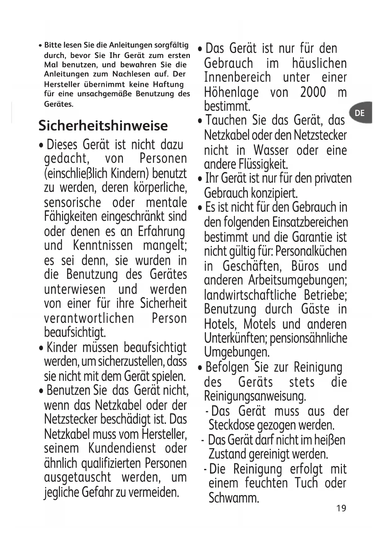 - Befolgen Sie zur Reinigung des Geräts stets die Reinigungsanweisung. - Das Gerät muss aus der Steckdose gezogen werden. - Das Gerät darf nicht im heißen Zustand gereinigt werden. - Die Reinigung erfolgt mit einem feuchten Tuch oder Schwamm. DE20 - Tauchen Sie das Gerät nicht in Wasser und stellen Sie es nicht unter laufendes Wasser.