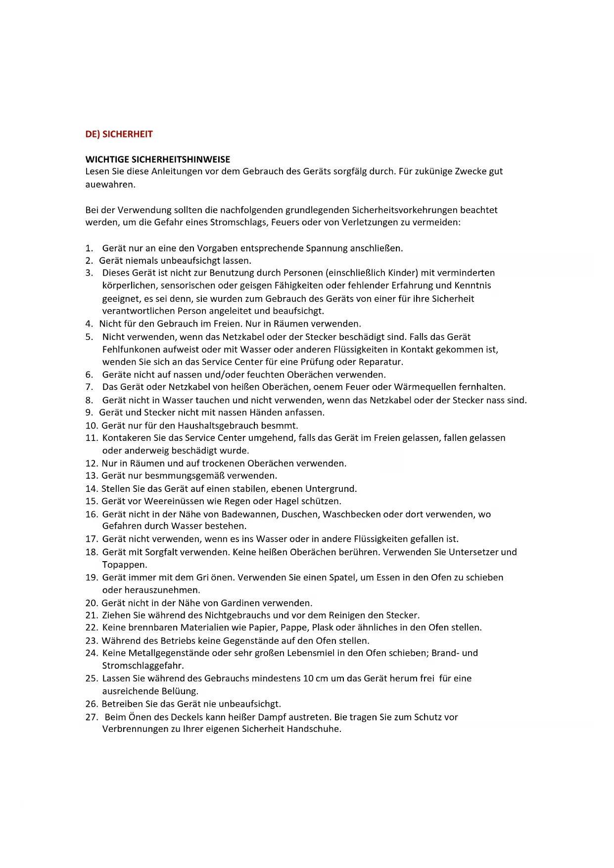 26. Betreiben Sie das Gerät nie unbeaufsichtigt.