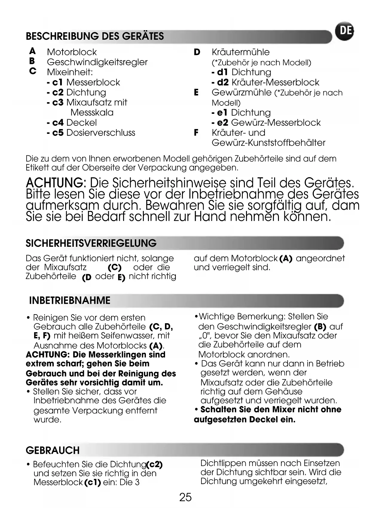Kräutermühle (*Zubehör je nach Modell) - d1 Dichtung - d2 Kräuter-Messerblock Gewürzmühle (*Zubehör je nach Modell) - e1 Dichtung - e2 Gewürz-Messerblock Kräuter- und Gewürz-Kunststoffbehälter Die zu dem von Ihnen erworbenen Modell gehörigen Zubehörteile sind auf demEtikett auf der Oberseite der Verpackung angegeben. ACHTUNG: Die Sicherheitshinweise sind Teil des Gerätes. Bitte lesen Sie diese vor der Inbetriebnahme des Gerätes aufmerksam durch. Bewahren Sie sie sorgfältig auf, damit Sie sie bei Bedarf schnell zur Hand nehmen können. SICHERHEITSVERRIEGELUNG INBETRIEBNAHME GEBRAUCH