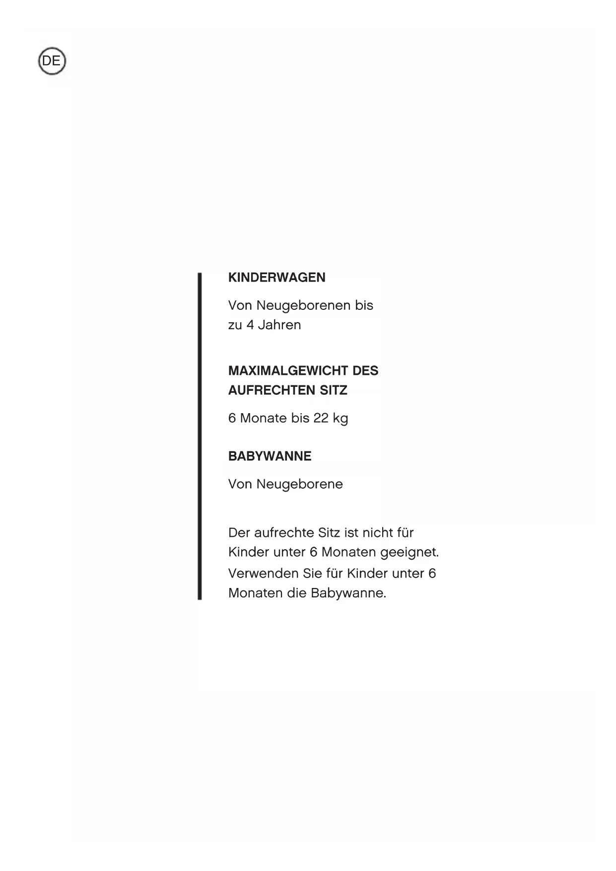 - Dieser Kinderwagen ist für Kinder im Alter von Neugeborenen bis zu 4 Jahren. Altersspanne für den Hauptsitz: 6 Monate bis 22 kg. Altersspanne in die Babywanne: Neugeborene bis 9 kg. Die Babywanne wird für Neugeborene empfohlen. • Die Babywanne darf nicht mehr verwendet werden, sobald das Kind sich selbst aufsetzen, drehen und sich auf den Händen und Knien aufstützen kann. Maximalgewicht für Kinder in die Babywanne: 9kg. • Der aufrechte Sitz ist nicht für Kinder unter 6 Monaten geeignet. • Der Buggy darf maximal für 1 Kinder benutzt werden. • Lassen Sie das Kind nie unbeaufsichtigt. • Verwenden Sie immer das Rückhaltesystem. • Zubehör oder Ersatzteile, die nicht vom Hersteller empfohlen werden, dürfen nicht eingesetzt werden. • Bitte verwenden Sie keine zusätzliche Matratze. • Bitte keinerlei Lasten an den Griff und/oder andere Teile des Kinderwagens. Dies kann die Stabilität des Kinderwagens beeinträchtigt. • Überschreiten Sie die Maximallast der Gepäckablage