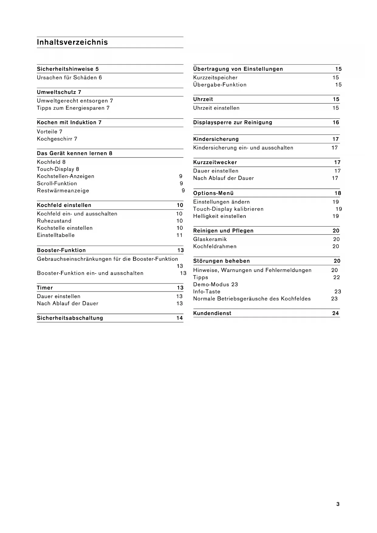 Booster-Funktion ein- und ausschalten 13 Timer 13 Dauer einstellen 13 Nach Ablauf der Dauer 13 Sicherheitsabschaltung 14 Übertragung von Einstellungen 15 Kurzzeitspeicher 15 Übergabe-Funktion 15 Uhrzeit 15 Uhrzeit einstellen 15 Displaysperre zur Reinigung 16 Kindersicherung 17 Kindersicherung ein- und ausschalten 17 Kurzzeitwecker 17 Dauer einstellen 17 Nach Ablauf der Dauer 17 Options-Menü 18 Einstellungen ändern 19 Touch-Display kalibrieren 19 Helligkeit einstellen 19 Reinigen und Pflegen 20 Glaskeramik 20 Kochfeldrahmen 20 Störungen beheben 20 Hinweise, Warnungen und Fehlermeldungen 20 Tipps 22 Demo-Modus 23 Info-Taste 23 Normale Betriebsgeräusche des Kochfeldes 23 Kundendienst 244 Weitere Informationen zu Produkten, Zubehör, Ersatz- teilen und Service finden Sie im Internet unter www.gaggenau.com und in unserem Online-Shop www.gaggenau-eshop.com5 m Sicherheitshinweise Diese Anleitung sorgfältig lesen. Die Gebrauchs- und Montageanleitung sowie den Gerätepass für einen späteren Gebrauch oder für Nachbesitzer aufbewahren. Prüfen Sie das Gerät nach dem Auspacken. Falls das Gerät beim Transport Schaden genommen hat, schließen Sie es nicht an, rufen Sie den Kundendienst und halten Sie die Schäden schriftlich fest, sonst verlieren Sie das Recht auf Entschädigung. Der Einbau des Gerätes muss gemäß der bei- gefügten Montageanleitung erfolgen. Dieses Gerät ist nur für den privaten Haushalt und das häusliche Umfeld bestimmt. Das Gerät nur zum Zubereiten von Speisen und Getränken benutzen. Der Kochvorgang muss beaufsichtigt werden. Ein kurzzeitiger Kochvor- gang muss ununterbrochen beaufsichtigt wer- den. Das Gerät nur in geschlossenen Räumen verwenden. Dieses Gerät ist nicht für den Betrieb mit einer externen Zeitschaltuhr oder einer Fernsteue- rung bestimmt. Dieses Gerät kann von Kindern ab 8 Jahren und Personen mit reduzierten physischen, sen- sorischen oder mentalen Fähigkeiten oder Mangel an Erfahrung oder Wissen benutzt werden, wenn sie von einer Person, die für ihre Sicherheit verantwortlich ist, beaufsichtigt oder von ihr bezüglich des sicheren Gebrauchs des Gerätes unterwiesen wurden und sie die daraus resultierenden Gefahren verstanden haben. Kinder dürfen nicht mit dem Gerät spielen. Reinigung und Benutzer-Wartung dürfen nicht durch Kinder durchgeführt werden, es sei denn, sie sind 8 Jahre und älter und werden beaufsichtigt. Kinder jünger als 8 Jahre vom Gerät und der Anschlussleitung fernhalten. Brandgefahr! ▯ Heißes Öl und Fett entzündet sich schnell. Heißes Öl und Fett nie unbeaufsichtigt las- sen. Nie ein Feuer mit Wasser löschen. Kochstelle ausschalten. Flammen vorsich- tig mit Deckel, Löschdecke oder Ähnli- chem ersticken. Brandgefahr! ▯ Die Kochstellen werden sehr heiß. Nie brennbare Gegenstände auf das Kochfeld legen. Keine Gegenstände auf dem Koch- feld lagern. Brandgefahr! ▯ Das Gerät wird heiß. Nie brennbare Gegenstände oder Spraydosen in Schub- laden direkt unter dem Kochfeld aufbewah- ren. Brandgefahr! ▯ Das Kochfeld schaltet sich von selbst ab und lässt sich nicht mehr bedienen. Es kann sich später unbeabsichtigt einschal- ten. Sicherung im Sicherungskasten aus- schalten. Kundendienst rufen. Verbrennungsgefahr! ▯ Die Kochstellen und deren Umgebung, ins- besondere der Kochfeldrahmen, werden sehr heiß. Die heißen Flächen nie berüh- ren. Kinder fernhalten. Verbrennungsgefahr! ▯ Die Kochstelle heizt, aber die Anzeige funktioniert nicht. Sicherung im Siche- rungskasten ausschalten. Kundendienst rufen. Verbrennungsgefahr! ▯ Gegenstände aus Metall werden auf dem Kochfeld sehr schnell heiß. Nie Gegen- stände aus Metall, wie z. B. Messer, Gabeln, Löffel und Deckel auf dem Koch- feld ablegen. Brandgefahr! ▯ Nach jedem Gebrauch das Kochfeld mit dem Hauptschalter ausschalten. Warten Sie nicht, bis sich das Kochfeld automa- tisch ausschaltet, weil sich keine Kochge- fäße mehr darauf befinden.6 Stromschlaggefahr! ▯ Unsachgemäße Reparaturen sind gefähr- lich. Nur ein von uns geschulter Kunden- dienst-Techniker darf Reparaturen durchführen und beschädigte Anschluss- leitungen austauschen. Ist das Gerät defekt, Netzstecker ziehen oder Sicherung im Sicherungskasten ausschalten. Kun- dendienst rufen. S tro ms chl ag g efa hr ! ▯ Eindringende Feuchtigkeit kann einen Stromschlag verursachen. Keinen Hoch- druckreiniger oder Dampfreiniger verwen- den. S tro ms chl ag g efa hr ! ▯ Ein defektes Gerät kann einen Strom- schlag verursachen. Nie ein defektes Gerät einschalten. Netzstecker ziehen oder Sicherung im Sicherungskasten aus- schalten. Kundendienst rufen. S tro ms chl ag g efa hr ! ▯ Sprünge oder Brüche in der Glaskeramik können Stromschläge verursachen. Siche- rung im Sicherungskasten ausschalten. Kundendienst rufen. Elektromagnetische Gefahren! Das Gerät entspricht den Anforderungen an Sicherheit und elektromagnetischer Verträg- lichkeit. Dennoch dürfen sich Personen mit Herzschrittmachern dem Gerät nicht annä- hern. Man kann nicht mit absoluter Sicherheit davon ausgehen, dass 100 % dieser auf dem Markt erhältlichen Geräte den Anforderungen an die elektromagnetische Verträglichkeit ent- sprechen und dass keine Störungen verur- sacht werden, die eine korrekte Funktionsweise derselben beeinträchtigen. Es ist auch möglich, dass Personen mit anderen Geräten, wie Hörgeräten, Störungen bemer- ken. Beschädigungsgefahr! Das Kochfeld ist an der Unterseite mit einem Gebläse ausgestattet. Befindet sich unter dem Kochfeld eine Schublade, dürfen in dieser keine kleinen Gegenstände oder Papier aufbe- wahrt werden. Sie könnten aufgesaugt werden und das Gebläse beschädigen oder die Küh- lung beeinträchtigen. Zwischen dem Inhalt der Schublade und dem Gebläseeingang muss ein Mindestabstand von 2 cm vorhanden sein. Verletzungsgefahr! ▯ Beim Garen im Wasserbad können Koch- feld und Kochgefäß durch Überhitzung zer- springen. Das Kochgefäß im Wasserbad darf den Boden des mit