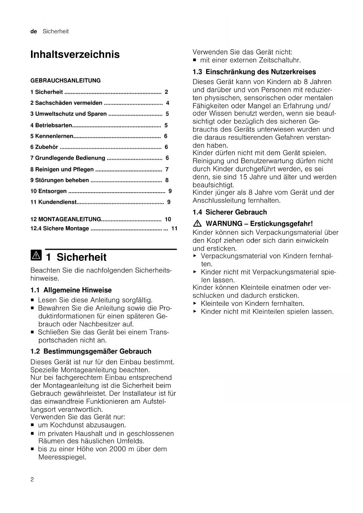 1 Sicherheit Beachten Sie die nachfolgenden Sicherheits- hinweise. 1.1 Allgemeine Hinweise ¡ Lesen Sie diese Anleitung sorgfältig. ¡ Bewahren Sie die Anleitung sowie die Pro- duktinformationen für einen späteren Ge- brauch oder Nachbesitzer auf. ¡ Schließen Sie das Gerät bei einem Trans- portschaden nicht an. 1.2 Bestimmungsgemäßer Gebrauch Dieses Gerät ist nur für den Einbau bestimmt. Spezielle Montageanleitung beachten. Nur bei fachgerechtem Einbau entsprechend der Montageanleitung ist die Sicherheit beim Gebrauch gewährleistet. Der Installateur ist für das einwandfreie Funktionieren am Aufstel- lungsort verantwortlich. Verwenden Sie das Gerät nur: ¡ um Kochdunst abzusaugen. ¡ im privaten Haushalt und in geschlossenen Räumen des häuslichen Umfelds. ¡ bis zu einer Höhe von 2000m über dem Meeresspiegel. Verwenden Sie das Gerät nicht: ¡ mit einer externen Zeitschaltuhr. 1.3 Einschränkung des Nutzerkreises Dieses Gerät kann von Kindern ab 8 Jahren und darüber und von Personen mit reduzier- ten physischen, sensorischen oder mentalen Fähigkeiten oder Mangel an Erfahrung und/ oder Wissen benutzt werden, wenn sie beauf- sichtigt oder bezüglich des sicheren Ge- brauchs des Geräts unterwiesen wurden und die daraus resultierenden Gefahren verstan- den haben. Kinder dürfen nicht mit dem Gerät spielen. Reinigung und Benutzerwartung dürfen nicht durch Kinder durchgeführt werden, es sei denn, sie sind 15 Jahre und älter und werden beaufsichtigt. Kinder jünger als 8 Jahre vom Gerät und der Anschlussleitung fernhalten. 1.4 Sicherer Gebrauch WARNUNG‒Erstickungsgefahr! Kinder können sich Verpackungsmaterial über den Kopf ziehen oder sich darin einwickeln und ersticken. ▶ Verpackungsmaterial von Kindern fernhal- ten. ▶ Kinder nicht mit Verpackungsmaterial spie- len lassen. Kinder können Kleinteile einatmen oder ver- schlucken und dadurch ersticken. ▶ Kleinteile von Kindern fernhalten. ▶ Kinder nicht mit Kleinteilen spielen lassen.Sicherheit de