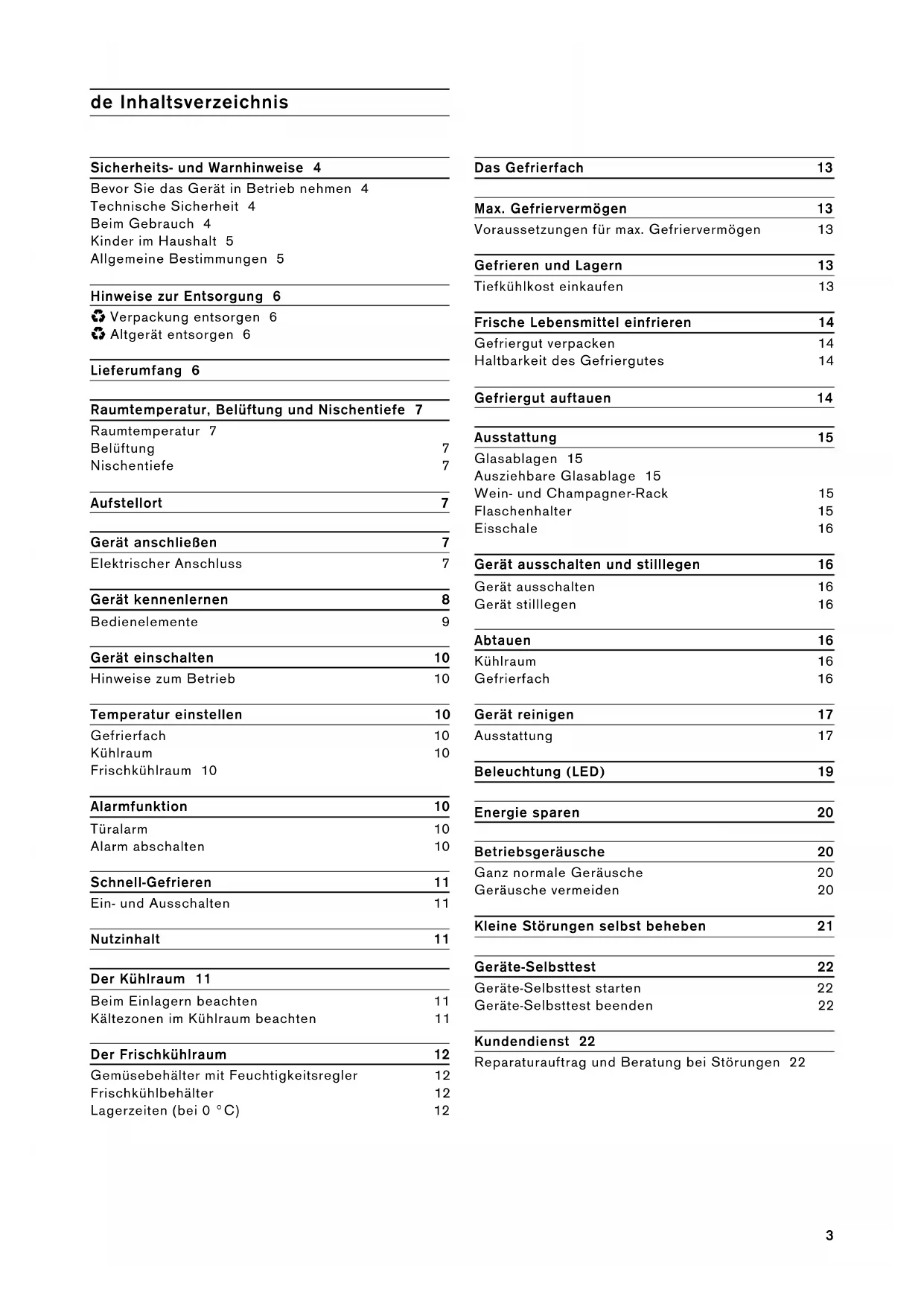 - Altgerät entsorgen 6 Lieferumfang 6 Raumtemperatur, Belüftung und Nischentiefe 7 Raumtemperatur 7 Belüftung 7 Nischentiefe 7 Aufstellort 7 Gerät anschließen 7 Elektrischer Anschluss 7 Gerät kennenlernen 8 Bedienelemente 9 Gerät einschalten 10 Hinweise zum Betrieb 10 Temperatur einstellen 10 Gefrierfach 10 Kühlraum 10 Frischkühlraum 10 Alarmfunktion 10 Türalarm 10 Alarm abschalten 10 Schnell-Gefrieren 11 Ein- und Ausschalten 11 Nutzinhalt 11 Der Kühlraum 11 Beim Einlagern beachten 11 Kältezonen im Kühlraum beachten 11 Der Frischkühlraum 12 Gemüsebehälter mit Feuchtigkeitsregler 12 Frischkühlbehälter 12 Lagerzeiten (bei 0 °C) 12 Das Gefrierfach 13 Max. Gefriervermögen 13 Voraussetzungen für max. Gefriervermögen 13 Gefrieren und Lagern 13 Tiefkühlkost einkaufen 13 Frische Lebensmittel einfrieren 14 Gefriergut verpacken 14 Haltbarkeit des Gefriergutes 14 Gefriergut auftauen 14 Ausstattung 15 Glasablagen 15 Ausziehbare Glasablage 15 Wein- und Champagner-Rack 15 Flaschenhalter 15 Eisschale 16 Gerät ausschalten und stilllegen 16 Gerät ausschalten 16 Gerät stilllegen 16 Abtauen 16 Kühlraum 16 Gefrierfach 16 Gerät reinigen 17 Ausstattung 17 Beleuchtung (LED) 19 Energie sparen 20 Betriebsgeräusche 20 Ganz normale Geräusche 20 Geräusche vermeiden 20 Kleine Störungen selbst beheben 21 Geräte-Selbsttest 22 Geräte-Selbsttest starten 22 Geräte-Selbsttest beenden 22 Kundendienst 22 Reparaturauftrag und Beratung bei Störungen 224 m Sicherheits- und Warnhinweise Bevor Sie das Gerät in Betrieb nehmen Lesen Sie Gebrauchs- und Montageanleitung aufmerksam durch! Sie enthalten wichtige Informationen über Aufstellen, Gebrauch und Wartung des Gerätes. Der Hersteller haftet nicht, wenn Sie die Hinweise und Warnungen der Gebrauchsanleitung missachten. Bewahren Sie alle Unterlagen für späteren Gebrauch oder für Nachbesitzer auf. Technische Sicherheit Das Gerät enthält in geringer Menge das umweltfreundliche, aber brennbare Kältemittel R600a. Achten Sie darauf, dass die Rohre des Kältemittel-Kreislaufes bei Transport oder Montage nicht beschädigt werden. Herausspritzendes Kältemittel kann zu Augenverletzungen führen oder sich entzünden. Bei Beschädigung ▯ offenes Feuer oder Zündquellen vom Gerät fernhalten, ▯ Raum für einige Minuten gut durchlüften, ▯ Gerät ausschalten und Netzstecker ziehen, ▯ Kundendienst benachrichtigen. Je mehr Kältemittel in einem Gerät ist, umso größer muss der Raum sein, in dem das Gerät steht. In zu kleinen Räumen kann bei einem Leck ein brennbares Gas-Luft- Gemisch entstehen. Pro 8 g Kältemittel muss der Raum mindestens 1 m³ groß sein. Die Menge des Kältemittels Ihres Gerätes steht auf dem Typenschild im Inneren des Gerätes. Wenn die Netzanschlussleitung dieses Gerätes beschädigt wird, muss sie durch den Hersteller, Kundendienst oder eine ähnlich qualifizierte Person ersetzt werden. Unsachgemäße Installationen und Reparaturen können den Benutzer erheblich gefährden. Reparaturen dürfen nur durch den Hersteller, Kundendienst oder eine ähnlich qualifizierte Person durchgeführt werden. Es dürfen nur Originalteile des Herstellers benutzt werden. Nur bei diesen Teilen gewährleistet der Hersteller, dass sie die Sicherheitsanforderungen erfüllen. Eine Verlängerung der Netzanschlussleitung darf nur über den Kundendienst bezogen werden. Beim Gebrauch ▯ Nie elektrische Geräte innerhalb des Gerätes verwenden (z. B. Heizgeräte, elektrische Eisbereiter usw.). Explosionsgefahr! ▯ Nie das Gerät mit einem Dampfreinigungsgerät abtauen oder reinigen! Der Dampf kann an elektrische Teile gelangen und einen Kurzschluss auslösen. Stromschlaggefahr! ▯ Keine spitzen oder scharfkantigen Gegenstände verwenden, um Reif- und Eisschichten zu entfernen. Sie könnten damit die Kältemittel-Rohre beschädigen. Herausspritzendes Kältemittel kann sich entzünden oder zu Augenverletzungen führen. ▯ Keine Produkte mit brennbaren Treibgasen (z. B. Spraydosen) und keine explosiven Stoffe lagern. Explosionsgefahr! ▯ Sockel, Auszüge, Türen usw. nicht als Trittbrett oder zum Abstützen missbrauchen.5 ▯ Zum Abtauen und Reinigen Netzstecker ziehen oder Sicherung ausschalten. Am Netzstecker ziehen, nicht am Anschlusskabel. ▯ Hochprozentigen Alkohol nur dicht verschlossen und stehend lagern. ▯ Kunststoffteile und Türdichtung nicht mit Öl oder Fett verschmutzen. Kunststoffteile und Türdichtung werden sonst porös. ▯ Be- und Entlüftungsöffnungen für das Gerät nie abdecken oder zustellen. ▯ Vermeidung von Risiken für Kinder und gefährdete Personen: Gefährdet sind Kinder, Personen, die körperlich, psychisch oder in ihrer Wahrnehmung eingeschränkt sind sowie Personen, die nicht genügend Wissen über die sichere Bedienung des Gerätes haben. Stellen Sie sicher, dass Kinder und gefährdete Personen die Gefahren verstanden haben. Eine für die Sicherheit verantwortliche Person muss Kinder und gefährdete Personen am Gerät beaufsichtigen oder anleiten. Nur Kinder ab 8 Jahren das Gerät benutzen lassen. Bei Reinigung und Wartung Kinder beaufsichtigen. Niemals Kinder mit dem Gerät spielen lassen. ▯ Im Gefrierraum keine Flüssigkeiten in Flaschen und Dosen lagern (besonders kohlensäurehaltige Getränke). Flaschen und Dosen können platzen! ▯ Nie Gefriergut sofort, nachdem es aus dem Gefrierraum genommen wird, in den Mund nehmen. Gefrierverbrennungsgefahr! ▯ Vermeiden Sie längeren Kontakt der Hände mit dem Gefriergut, Eis oder den Verdampferrohren usw. Gefrierverbrennungsgefahr! Kinder im Haushalt ▯ Verpackung und deren Teile nicht Kindern überlassen. Erstickungsgefahr durch Faltkartons und Folien! ▯ Das Gerät ist kein Spielzeug für Kinder! ▯ Bei Gerät mit Türschloss: Schlüssel außer Reichweite von Kindern aufbewahren! Allgemeine Bestimmungen Das Gerät eignet sich ▯ zum Kühlen und Gefrieren von Lebensmitteln, ▯ zur Eisbereitung. Dieses Gerät ist für den häuslichen Gebrauch im Priva