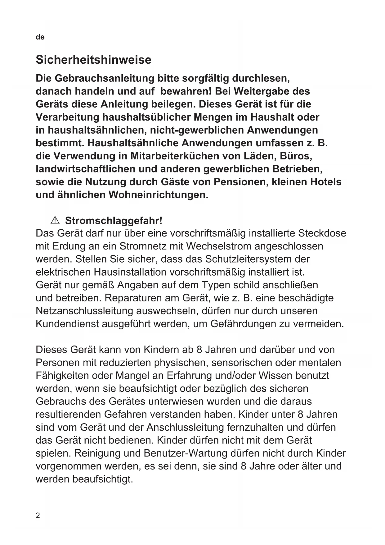 Sicherheitshinweise Die Gebrauchsanleitung bitte sorgfältig durchlesen, danach handeln und auf bewahren! Bei Weitergabe des Geräts diese Anleitung beilegen. Dieses Gerät ist für die Verarbeitung haushaltsüblicher Mengen im Haushalt oder in haushaltsähnlichen, nicht-gewerblichen Anwendungen bestimmt. Haushaltsähnliche Anwendungen umfassen z. B. die Verwendung in Mitarbeiterküchen von Läden, Büros, landwirtschaftlichen und anderen gewerblichen Betrieben, sowie die Nutzung durch Gäste von Pensionen, kleinen Hotels und ähnlichen Wohneinrichtungen. A Stromschlaggefahr! Das Gerät darf nur über eine vorschriftsmäßig installierte Steckdose mit Erdung an ein Stromnetz mit Wechselstrom angeschlossen werden. Stellen Sie sicher, dass das Schutzleitersystem der elektrischen Hausinstallation vorschriftsmäßig installiert ist. Gerät nur gemäß Angaben auf dem Typen schild anschließen und betreiben. Reparaturen am Gerät, wie z. B. eine beschädigte Netzanschlussleitung auswechseln, dürfen nur durch unseren Kundendienst ausgeführt werden, um Gefährdungen zu vermeiden. Dieses Gerät kann von Kindern ab 8 Jahren und darüber und von Personen mit reduzierten physischen, sensorischen oder mentalen Fähigkeiten oder Mangel an Erfahrung und/oder Wissen benutzt werden, wenn sie beaufsichtigt oder bezüglich des sicheren Gebrauchs des Gerätes unterwiesen wurden und die daraus resultierenden Gefahren verstanden haben. Kinder unter 8 Jahren sind vom Gerät und der Anschlussleitung fernzuhalten und dürfen das Gerät nicht bedienen. Kinder dürfen nicht mit dem Gerät spielen. Reinigung und BenutzerWartung dürfen nicht durch Kinder vorgenommen werden, es sei denn, sie sind 8 Jahre oder älter und werden beaufsichtigt.3