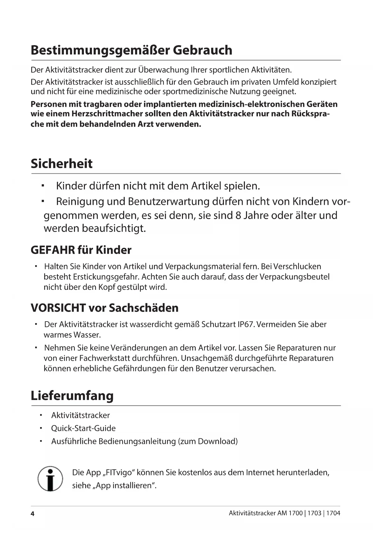 Aktivitätstracker AM 1700 | 1703 | 1704 Bestimmungsgemäßer Gebrauch Der Aktivitätstracker dient zur Überwachung Ihrer sportlichen Aktivitäten. Der Aktivitätstracker ist ausschließlich für den Gebrauch im privaten Umfeld konzipiert und nicht für eine medizinische oder sportmedizinische Nutzung geeignet. Personen mit tragbaren oder implantierten medizinisch-elektronischen Geräten wie einem Herzschrittmacher sollten den Aktivitätstracker nur nach Rückspra- che mit dem behandelnden Arzt verwenden. Sicherheit Kinder dürfen nicht mit dem Artikel spielen. Reinigung und Benutzerwartung dürfen nicht von Kindern vor- genommen werden, es sei denn, sie sind 8 Jahre oder älter und werden beaufsichtigt. GEFAHR für Kinder Halten Sie Kinder von Artikel und Verpackungsmaterial fern. Bei Verschlucken besteht Erstickungsgefahr. Achten Sie auch darauf, dass der Verpackungsbeutel nicht über den Kopf gestülpt wird. VORSICHT vor Sachschäden Der Aktivitätstracker ist wasserdicht gemäß Schutzart IP67. Vermeiden Sie aber warmes Wasser. Nehmen Sie keine Veränderungen an dem Artikel vor. Lassen Sie Reparaturen nur von einer Fachwerkstatt durchführen. Unsachgemäß durchgeführte Reparaturen können erhebliche Gefährdungen für den Benutzer verursachen. Lieferumfang Aktivitätstracker Quick-Start-Guide Ausführliche Bedienungsanleitung (zum Download) Die App „FITvigo“ können Sie kostenlos aus dem Internet herunterladen, siehe „App installieren“. Druckbuch AM 1700.indb 4 24.08.2017 14:07:54Auf einen Blick