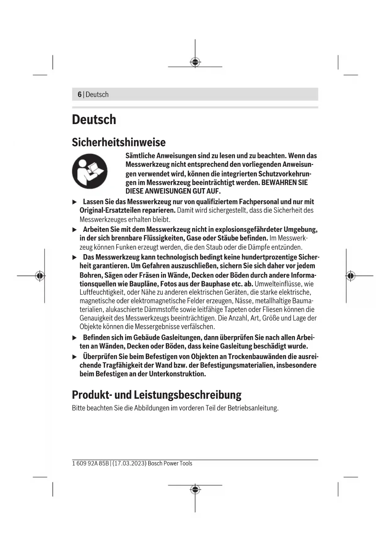 Bosch Power Tools 1 609 92A 85B | (17.03.2023)6 | Deutsch Deutsch Sicherheitshinweise Sämtliche Anweisungen sind zu lesen und zu beachten. Wenn das Messwerkzeug nicht entsprechend den vorliegenden Anweisun- gen verwendet wird, können die integrierten Schutzvorkehrun- gen im Messwerkzeug beeinträchtigt werden. BEWAHREN SIE DIESE ANWEISUNGEN GUT AUF. u Lassen Sie das Messwerkzeug nur von qualifiziertem Fachpersonal und nur mit Original-Ersatzteilen reparieren. Damit wird sichergestellt, dass die Sicherheit des Messwerkzeuges erhalten bleibt. u Arbeiten Sie mit dem Messwerkzeug nicht in explosionsgefährdeter Umgebung, in der sich brennbare Flüssigkeiten, Gase oder Stäube befinden. Im Messwerk- zeug können Funken erzeugt werden, die den Staub oder die Dämpfe entzünden. u Das Messwerkzeug kann technologisch bedingt keine hundertprozentige Sicher- heit garantieren. Um Gefahren auszuschließen, sichern Sie sich daher vor jedem Bohren, Sägen oder Fräsen in Wände, Decken oder Böden durch andere Informa- tionsquellen wie Baupläne, Fotos aus der Bauphase etc. ab. Umwelteinflüsse, wie Luftfeuchtigkeit, oder Nähe zu anderen elektrischen Geräten, die starke elektrische, magnetische oder elektromagnetische Felder erzeugen, Nässe, metallhaltige Bauma- terialien, alukaschierte Dämmstoffe sowie leitfähige Tapeten oder Fliesen können die Genauigkeit des Messwerkzeugs beeinträchtigen. Die Anzahl, Art, Größe und Lage der Objekte können die Messergebnisse verfälschen. u Befinden sich im Gebäude Gasleitungen, dann überprüfen Sie nach allen Arbei- ten an Wänden, Decken oder Böden, dass keine Gasleitung beschädigt wurde. u Überprüfen Sie beim Befestigen von Objekten an Trockenbauwänden die ausrei- chende Tragfähigkeit der Wand bzw. der Befestigungsmaterialien, insbesondere beim Befestigen an der Unterkonstruktion. Produkt- und Leistungsbeschreibung Bitte beachten Sie die Abbildungen im vorderen Teil der Betriebsanleitung. 1 609 92A 85B | (17.03.2023) Bosch Power ToolsDeutsch | 7 Bestimmungsgemäßer Gebrauch Das Messwerkzeug ist bestimmt zur Suche nach Metallen (Eisen- und Nichteisenmetalle, z.B. Armierungseisen) und spannungsführenden Leitungen in Wänden, Decken und Fuß- böden sowie nach Holzbalken in Trockenbauwänden. Das Messwerkzeug ist zur Verwendung im Innenbereich geeignet. Abgebildete Komponenten Die Nummerierung der abgebildeten Komponenten bezieht sich auf die Darstellung des Messwerkzeugs auf der Grafikseite. (1) Batteriefachdeckel (2) Ein-/Aus-Taste/Messtaste (3) Display (Touchscreen) (4) Leuchtring (5) Markierungsöffnung (6) Sensorbereich (7) Seriennummer (8) Wandsensor (9) Grifffläche Anzeigenelemente (a) Navigationsbereich (b) Informationsbereich (c) Statusleiste (d) Anzeige Seitenzahl (nur bei mehrseitigen Menüs) (e) Anzeige Signalton (f) Batterie-Anzeige Technische Daten Digitales Ortungsgerät UniversalDetect Sachnummer 3603F813.. max. Erfassungstiefe