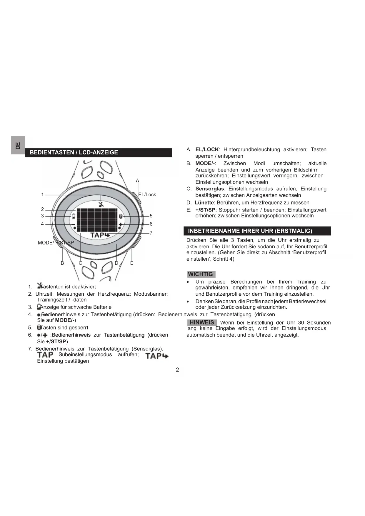 Subeinstellungsmodus aufrufen;Subeinstellungsmodus aufrufen; Einstellung bestätigen A. EL/LOCK: Hintergrundbeleuchtung aktivieren; Tasten sperren / entsperren B. MODE/-: Zwischen Modi umschalten; aktuelle Anzeige beenden und zum vorherigen Bildschirm zurückkehren; Einstellungswert verringern; zwischen Einstellungsoptionen wechseln C. Sensorglas: Einstellungsmodus aufrufen; Einstellung bestätigen; zwischen Anzeigearten wechseln D. Lünette: Berühren, um Herzfrequenz zu messen E. +/ST/SP: Stoppuhr starten / beenden; Einstellungswert erhöhen; zwischen Einstellungsoptionen wechseln INBETRIEBNAHME IHRER UHR (ERSTMALIG) Drücken Sie alle 3 Tasten, um die Uhr erstmalig zu aktivieren. Die Uhr fordert Sie sodann auf, Ihr Benutzerprol einzustellen. (Gehen Sie direkt zu Abschnitt ‘Benutzerprol einstellen’, Schritt 4). WICHTIG