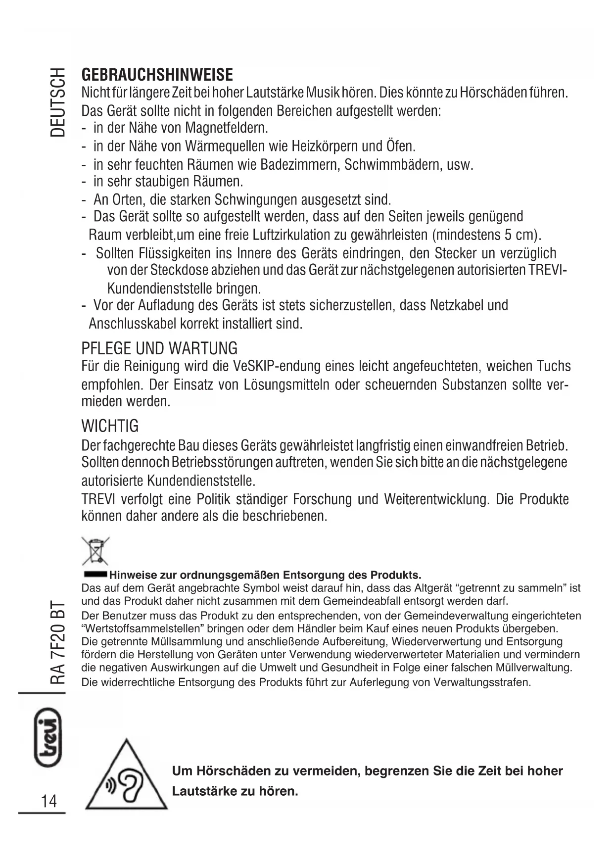 Für die Reinigung wird die VeSKIP-endung eines leicht angefeuchteten, weichen Tuchs empfohlen. Der Einsatz von Lösungsmitteln oder scheuernden Substanzen sollte ver- mieden werden. WICHTIG Der fachgerechte Bau dieses Geräts gewährleistet langfristig einen einwandfreien Betrieb. Sollten dennoch Betriebsstörungen auftreten, wenden Sie sich bitte an die nächstgelegene autorisierte Kundendienststelle. TREVI verfolgt eine Politik ständiger Forschung und Weiterentwicklung. Die Produkte können daher andere als die beschriebenen. DEUTSCH Um Hörschäden zu vermeiden, begrenzen Sie die Zeit bei hoher Lautstärke zu hören. Hinweise zur ordnungsgemäßen Entsorgung des Produkts. Das auf dem Gerät angebrachte Symbol weist darauf hin, dass das Altgerät “getrennt zu sammeln” ist und das Produkt daher nicht zusammen mit dem Gemeindeabfall entsorgt werden darf. Der Benutzer muss das Produkt zu den entsprechenden, von der Gemeindeverwaltung eingerichteten “Wertstoffsammelstellen” bringen oder dem Händler beim Kauf eines neuen Produkts übergeben. Die getrennte Müllsammlung und anschließende Aufbereitung, Wiederverwertung und Entsorgung fördern die Herstellung von Geräten unter Verwendung wiederverwerteter Materialien und vermindern die negativen Auswirkungen auf die Umwelt und Gesundheit in Folge einer falschen Müllverwaltung. Die widerrechtliche Entsorgung des Produkts führt zur Auferlegung von Verwaltungsstrafen.RA 7F20 BT