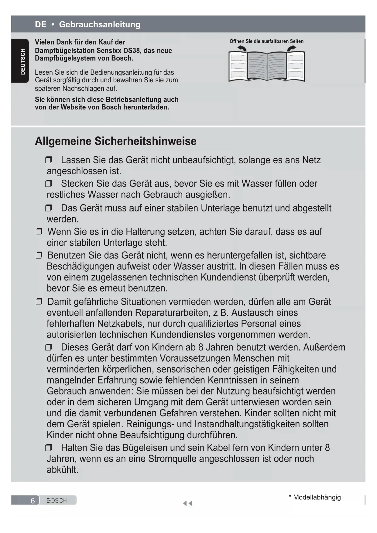 B O S C HDEUTSCH* Modellabhängig Vielen Dank für den Kauf der Dampfbügelstation Sensixx DS38, das neue Dampfbügelsystem von Bosch. Lesen Sie sich die Bedienungsanleitung für das Gerät sorgfältig durch und bewahren Sie sie zum späteren Nachschlagen auf. Sie können sich diese Betriebsanleitung auch von der Website von Bosch herunterladen. Öffnen Sie die ausfaltbaren Seiten Allgemeine Sicherheitshinweise ❐ Lassen Sie das Gerät nicht unbeaufsichtigt, solange es ans Netz angeschlossen ist. ❐ Stecken Sie das Gerät aus, bevor Sie es mit Wasser füllen oder restliches Wasser nach Gebrauch ausgießen. ❐ Das Gerät muss auf einer stabilen Unterlage benutzt und abgestellt werden. ❐ Wenn Sie es in die Halterung setzen, achten Sie darauf, dass es auf einer stabilen Unterlage steht. ❐ Benutzen Sie das Gerät nicht, wenn es heruntergefallen ist, sichtbare Beschädigungen aufweist oder Wasser austritt. In diesen Fällen muss es von einem zugelassenen technischen Kundendienst überprüft werden, bevor Sie es erneut benutzen. ❐ Damit gefährliche Situationen vermieden werden, dürfen alle am Gerät eventuell anfallenden Reparaturarbeiten, z B. Austausch eines fehlerhaften Netzkabels, nur durch qualiziertes Personal eines autorisierten technischen Kundendienstes vorgenommen werden. ❐ Dieses Gerät darf von Kindern ab 8 Jahren benutzt werden. Außerdem dürfen es unter bestimmten Voraussetzungen Menschen mit verminderten körperlichen, sensorischen oder geistigen Fähigkeiten und mangelnder Erfahrung sowie fehlenden Kenntnissen in seinem Gebrauch anwenden: Sie müssen bei der Nutzung beaufsichtigt werden oder in dem sicheren Umgang mit dem Gerät unterwiesen worden sein und die damit verbundenen Gefahren verstehen. Kinder sollten nicht mit dem Gerät spielen. Reinigungs- und Instandhaltungstätigkeiten sollten Kinder nicht ohne Beaufsichtigung durchführen. ❐ Halten Sie das Bügeleisen und sein Kabel fern von Kindern unter 8 Jahren, wenn es an eine Stromquelle angeschlossen ist oder noch abkühlt.7