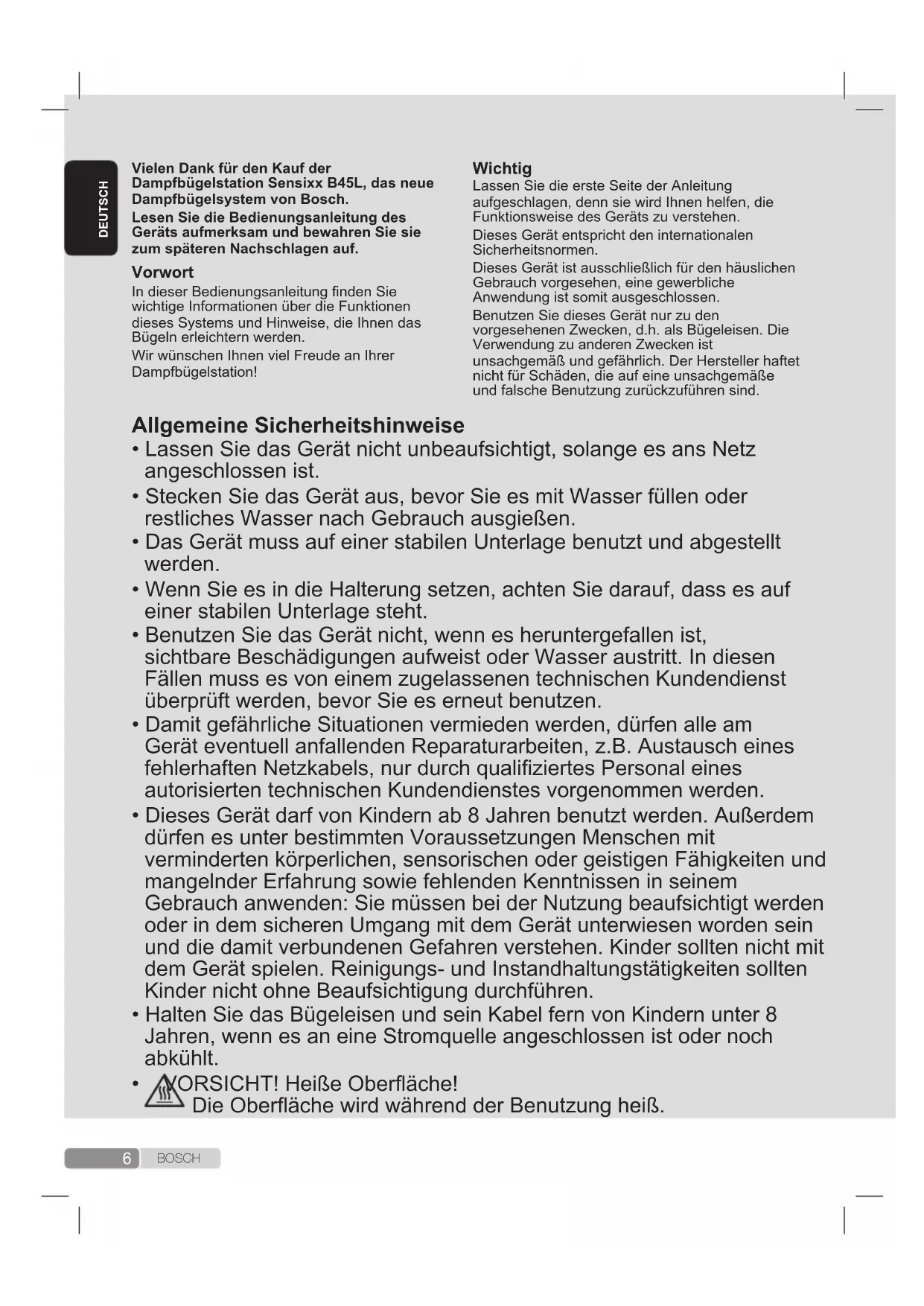 B O S C H DEUTSCH VielenDankfürdenKaufder DampfbügelstationSensixxB45L,dasneue DampfbügelsystemvonBosch. LesenSiedieBedienungsanleitungdes GerätsaufmerksamundbewahrenSiesie zumspäterenNachschlagenauf. Vorwort In dieser Bedienungsanleitung nden Sie wichtige Informationen über die Funktionen dieses Systems und Hinweise, die Ihnen das Bügeln erleichtern werden. Wir wünschen Ihnen viel Freude an Ihrer Dampfbügelstation! AllgemeineSicherheitshinweise
