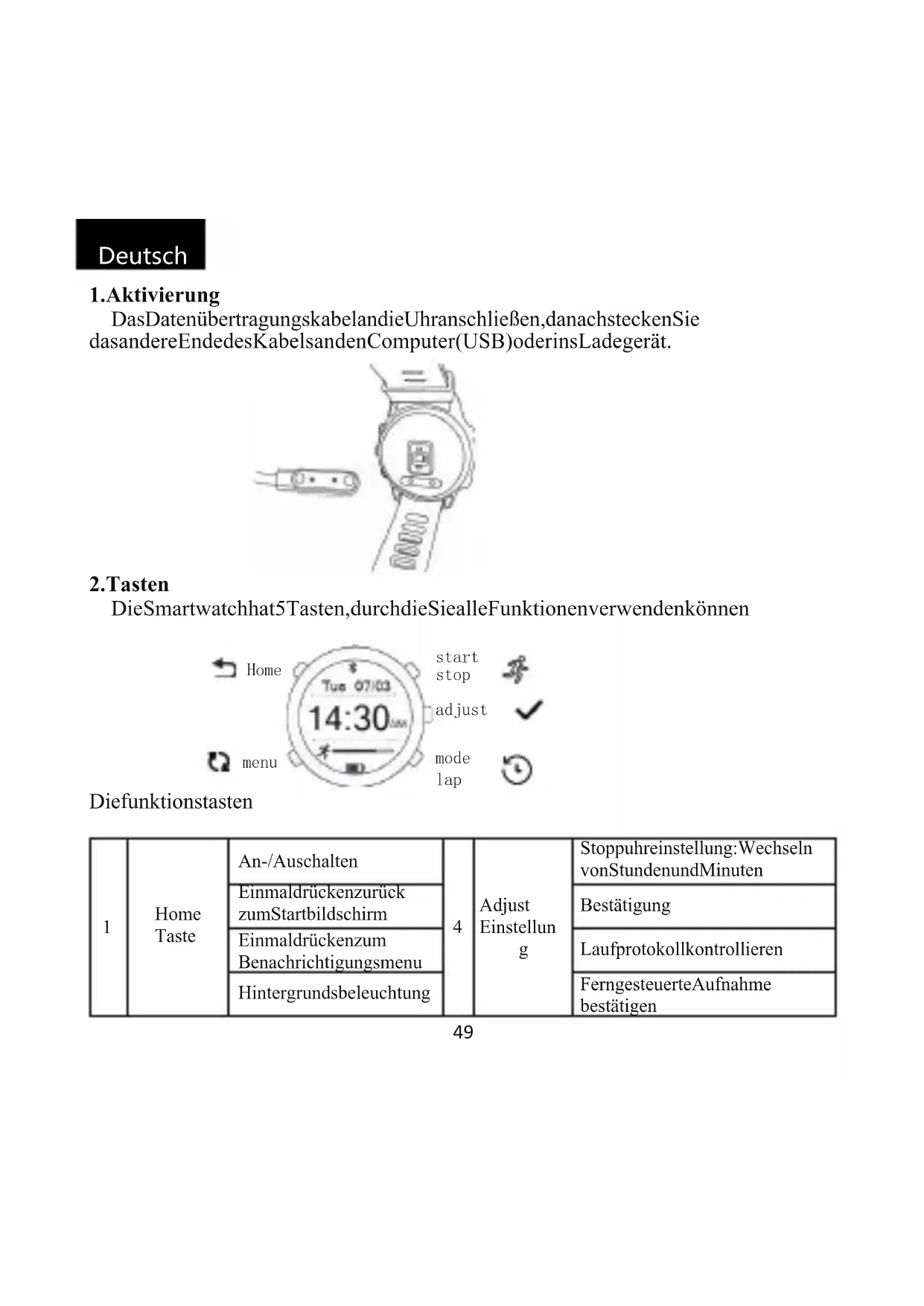 Stoppuhreinstellung: Wechseln von Stunden und Minuten Einmal drücken zurück zum Startbildschirm Bestätigung Einmal drücken zum Benachrichtigungsmenu Laufprotokoll kontrollieren Hintergrundsbeleuchtung Ferngesteuerte Aufnahme bestätigen Home menu start stop adjust mode lap Deutsch50