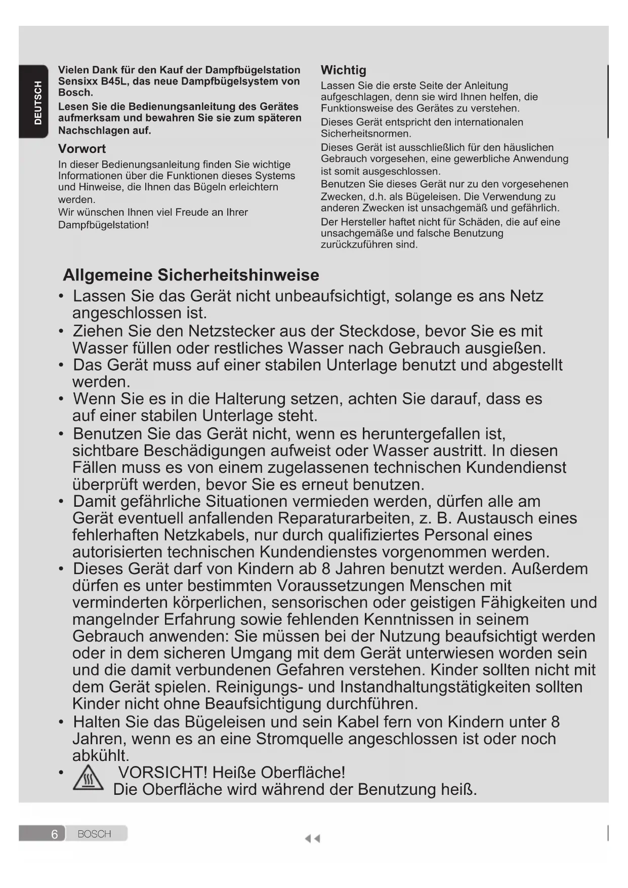 Lassen Sie die erste Seite der Anleitung aufgeschlagen, denn sie wird Ihnen helfen, die Funktionsweise des Gerätes zu verstehen. Dieses Gerät entspricht den internationalen Sicherheitsnormen. Dieses Gerät ist ausschließlich für den häuslichen Gebrauch vorgesehen, eine gewerbliche Anwendung ist somit ausgeschlossen. Benutzen Sie dieses Gerät nur zu den vorgesehenen Zwecken, d.h. als Bügeleisen. Die Verwendung zu anderen Zwecken ist unsachgemäß und gefährlich. Der Hersteller haftet nicht für Schäden, die auf eine unsachgemäße und falsche Benutzung zurückzuführen sind.7 B O S C H
