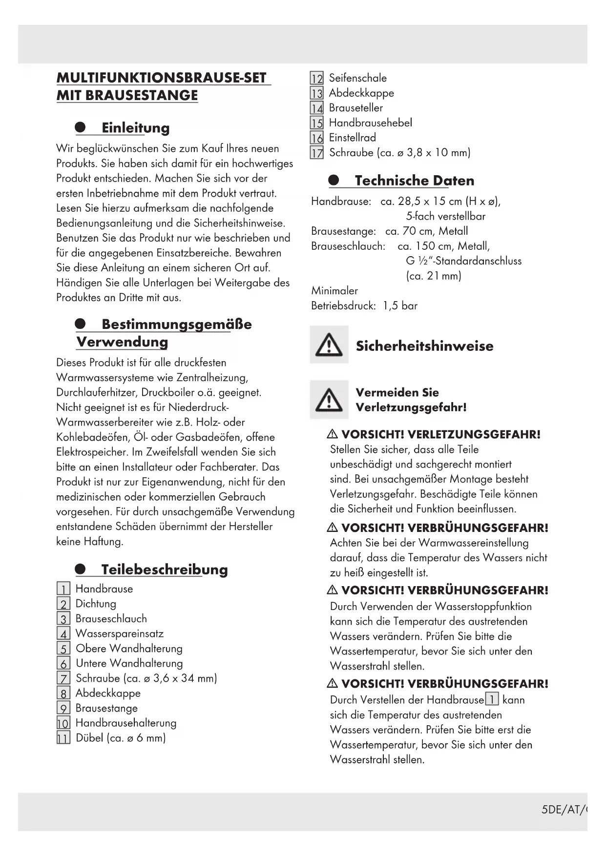 155DE/AT/CH MULTIFUNKTIONSBRAUSE-SET MIT BRAUSESTANGE Einleitung Wir beglückwünschen Sie zum Kauf Ihres neuen Produkts. Sie haben sich damit für ein hochwertiges Produkt entschieden. Machen Sie sich vor der ersten Inbetriebnahme mit dem Produkt vertraut. Lesen Sie hierzu aufmerksam die nachfolgende Bedienungsanleitung und die Sicherheitshinweise. Benutzen Sie das Produkt nur wie beschrieben und für die angegebenen Einsatzbereiche. Bewahren Sie diese Anleitung an einem sicheren Ort auf. Händigen Sie alle Unterlagen bei Weitergabe des Produktes an Dritte mit aus. Bestimmungsgemäße Verwendung Dieses Produkt ist für alle druckfesten Warmwassersysteme wie Zentralheizung, Durchlauferhitzer, Druckboiler o.ä. geeignet. Nicht geeignet ist es für Niederdruck- Warmwasserbereiter wie z.B. Holz- oder Kohlebadeöfen, Öl- oder Gasbadeöfen, offene Elektrospeicher. Im Zweifelsfall wenden Sie sich bitte an einen Installateur oder Fachberater. Das Produkt ist nur zur Eigenanwendung, nicht für den medizinischen oder kommerziellen Gebrauch vorgesehen. Für durch unsachgemäße Verwendung entstandene Schäden übernimmt der Hersteller keine Haftung. Teilebeschreibung