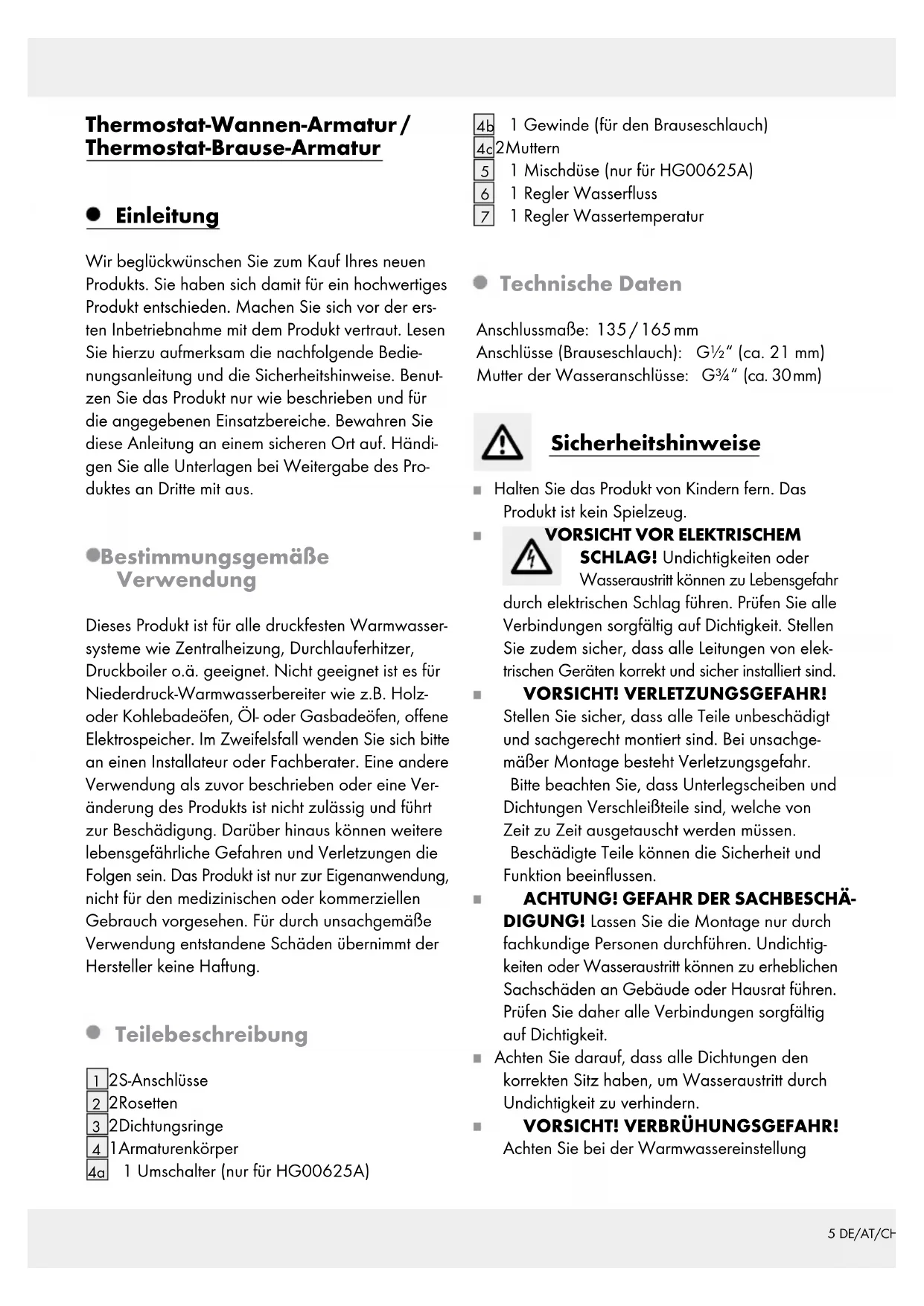 4b 46 HG00625A HG00625B5 DE/AT/CH Thermostat-Wannen-Armatur / Thermostat-Brause-Armatur Einleitung Wir beglückwünschen Sie zum Kauf Ihres neuen Produkts. Sie haben sich damit für ein hochwertiges Produkt entschieden. Machen Sie sich vor der ers- ten Inbetriebnahme mit dem Produkt vertraut. Lesen Sie hierzu aufmerksam die nachfolgende Bedie- nungsanleitung und die Sicherheitshinweise. Benut- zen Sie das Produkt nur wie beschrieben und für die angegebenen Einsatzbereiche. Bewahren Sie diese Anleitung an einem sicheren Ort auf. Händi- gen Sie alle Unterlagen bei Weitergabe des Pro- duktes an Dritte mit aus. Bestimmungsgemäße Verwendung Dieses Produkt ist für alle druckfesten Warmwasser- systeme wie Zentralheizung, Durchlauferhitzer, Druckboiler o.ä. geeignet. Nicht geeignet ist es für Niederdruck-Warmwasserbereiter wie z.B. Holz- oder Kohlebadeöfen, Öl- oder Gasbadeöfen, offene Elektrospeicher. Im Zweifelsfall wenden Sie sich bitte an einen Installateur oder Fachberater. Eine andere Verwendung als zuvor beschrieben oder eine Ver- änderung des Produkts ist nicht zulässig und führt zur Beschädigung. Darüber hinaus können weitere lebensgefährliche Gefahren und Verletzungen die Folgen sein. Das Produkt ist nur zur Eigenanwendung, nicht für den medizinischen oder kommerziellen Gebrauch vorgesehen. Für durch unsachgemäße Verwendung entstandene Schäden übernimmt der Hersteller keine Haftung. Teilebeschreibung