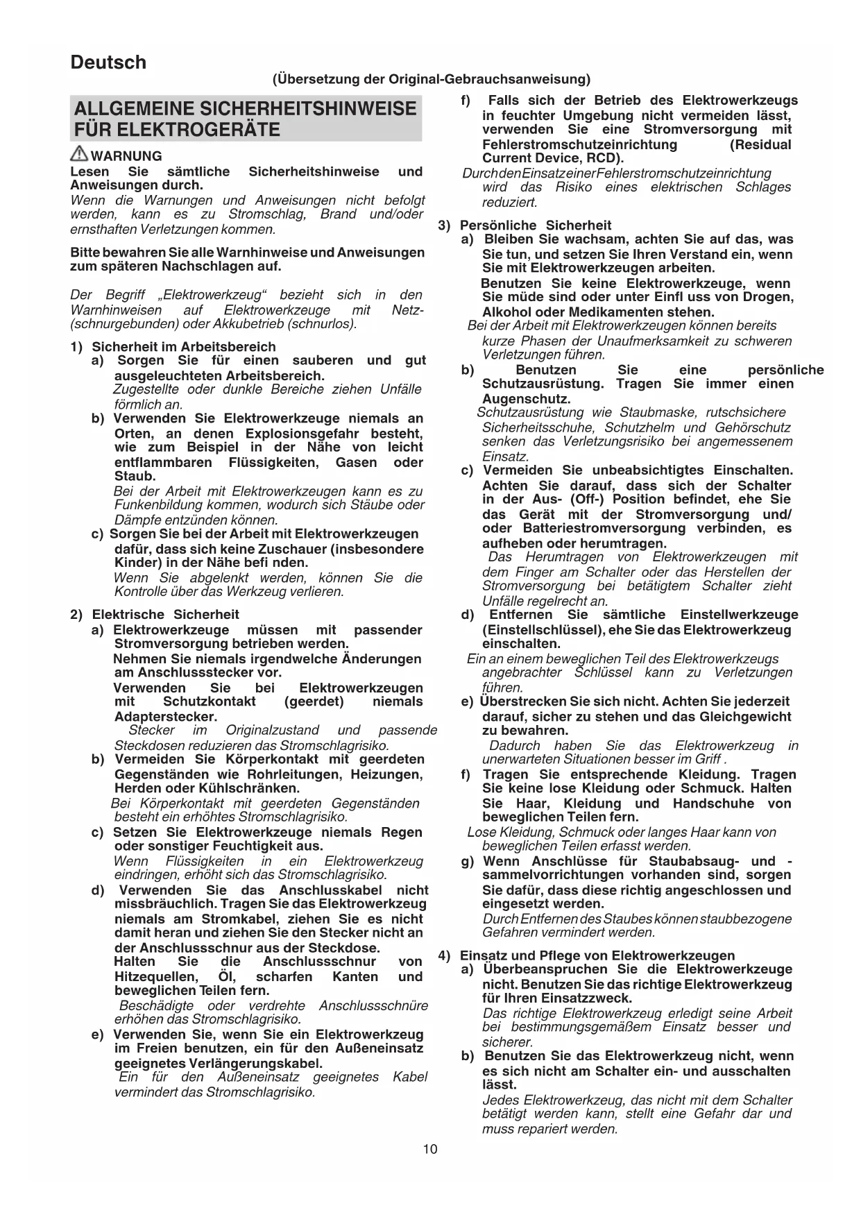 WARNUNG Lesen Sie sämtliche Sicherheitshinweise und Anweisungen durch. Wenn die Warnungen und Anweisungen nicht befolgt werden, kann es zu Stromschlag, Brand und/oder ernsthaften Verletzungen kommen. Bitte bewahren Sie alle Warnhinweise und Anweisungen zum späteren Nachschlagen auf. Der Begriff „Elektrowerkzeug“ bezieht sich in den Warnhinweisen auf Elektrowerkzeuge mit Netz- (schnurgebunden) oder Akkubetrieb (schnurlos).