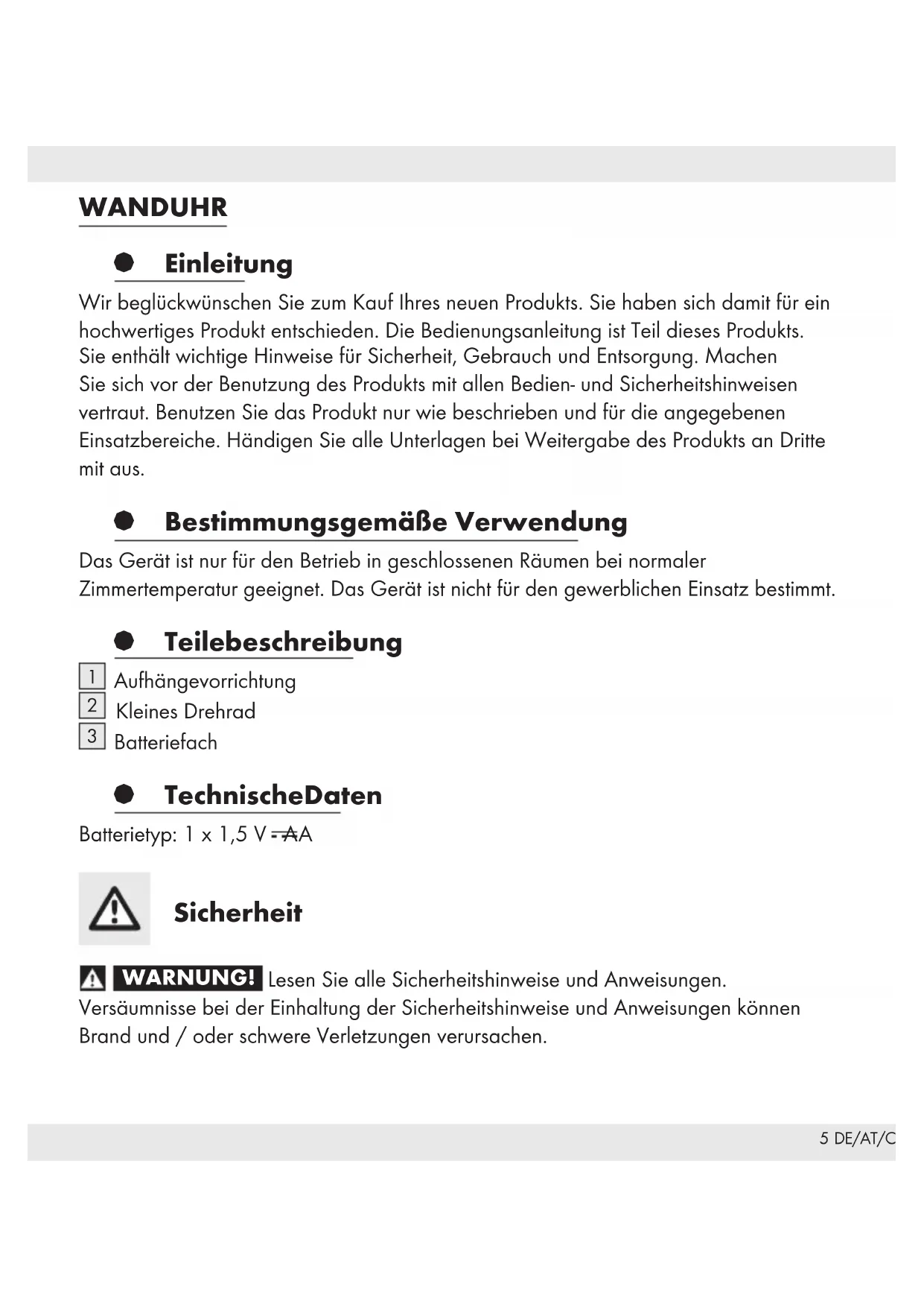 HG01602A HG01602B HG01602C HG01602D5 DE/AT/CH WANDUHR § Einleitung Wir beglückwünschen Sie zum Kauf Ihres neuen Produkts. Sie haben sich damit für ein hochwertiges Produkt entschieden. Die Bedienungsanleitung ist Teil dieses Produkts. Sie enthält wichtige Hinweise für Sicherheit, Gebrauch und Entsorgung. Machen Sie sich vor der Benutzung des Produkts mit allen Bedien- und Sicherheitshinweisen vertraut. Benutzen Sie das Produkt nur wie beschrieben und für die angegebenen Einsatzbereiche. Händigen Sie alle Unterlagen bei Weitergabe des Produkts an Dritte mit aus. § Bestimmungsgemäße Verwendung Das Gerät ist nur für den Betrieb in geschlossenen Räumen bei normaler Zimmertemperatur geeignet. Das Gerät ist nicht für den gewerblichen Einsatz bestimmt. § Teilebeschreibung