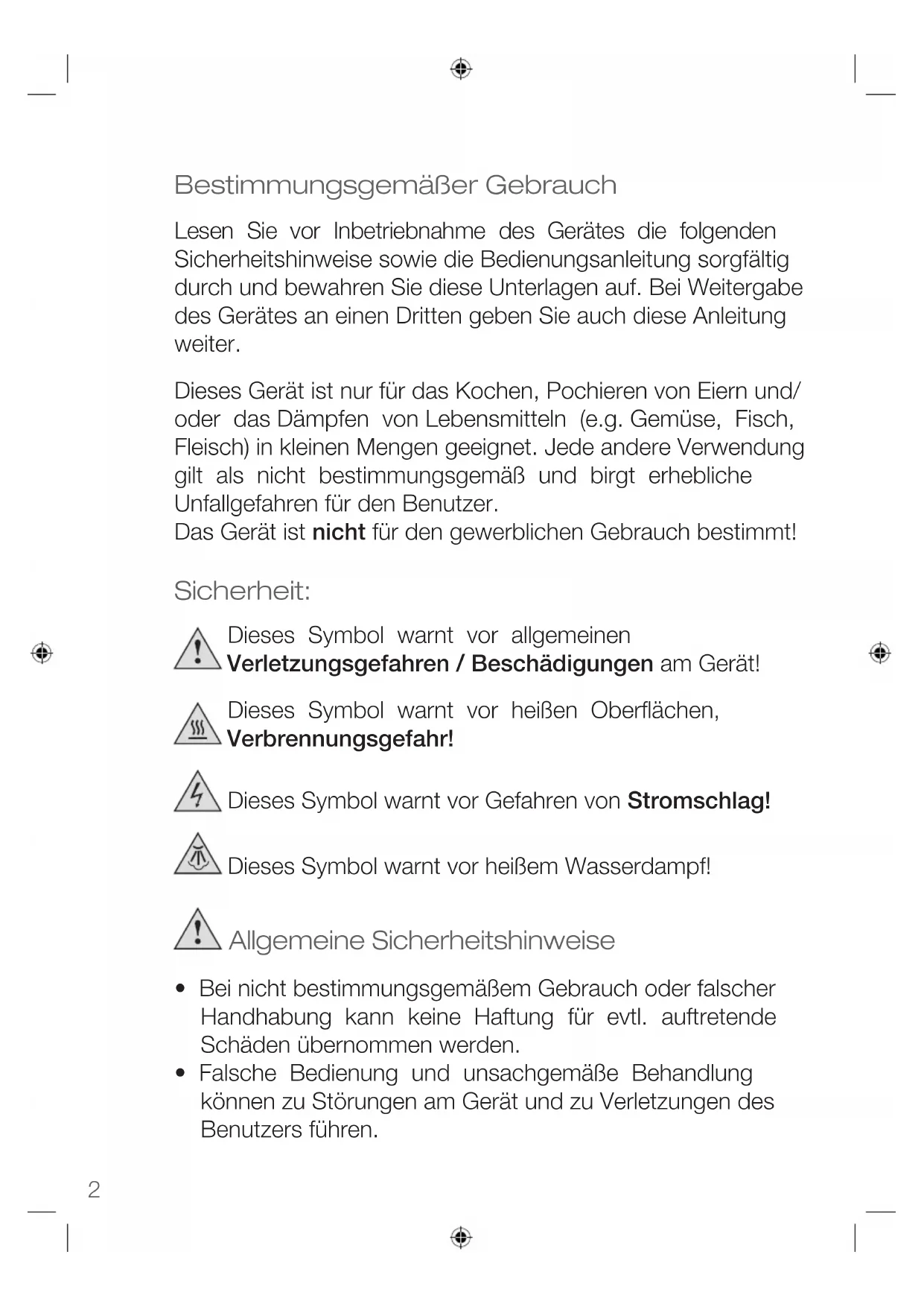 - Das Gerät darf nur für den vorgesehenen Zweck, d. h. zum Kochen von Eiern bzw. das Dämpfen von Lebensmitteln (e.g. Gemüse, Fisch, Fleisch) in kleinen Mengen, benutzt werden. Keine anderen Flüssigkeiten oder Lebensmittel darin erhitzen.