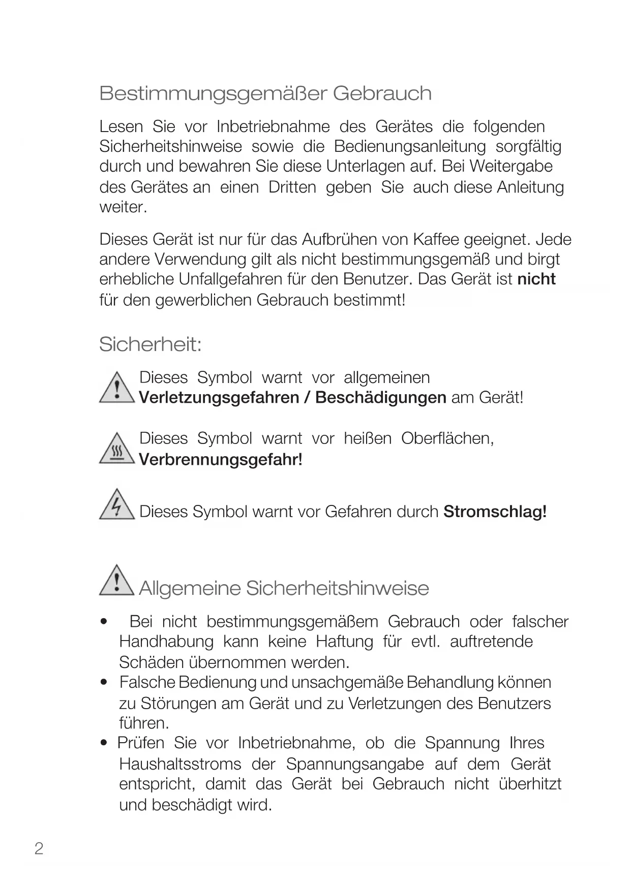 Bestimmungsgemäßer Gebrauch Lesen Sie vor Inbetriebnahme des Gerätes die folgenden Sicherheitshinweise sowie die Bedienungsanleitung sorgfältig durch und bewahren Sie diese Unterlagen auf. Bei Weitergabe des Gerätes an einen Dritten geben Sie auch diese Anleitung weiter. Dieses Gerät ist nur für das Aufbrühen von Kaffee geeignet. Jede andere Verwendung gilt als nicht bestimmungsgemäß und birgt erhebliche Unfallgefahren für den Benutzer. Das Gerät ist nicht für den gewerblichen Gebrauch bestimmt! Sicherheit: Dieses Symbol warnt vor allgemeinen Verletzungsgefahren / Beschädigungen am Gerät! Dieses Symbol warnt vor heißen Oberflächen, Verbrennungsgefahr! Dieses Symbol warnt vor Gefahren durch Stromschlag! Allgemeine Sicherheitshinweise