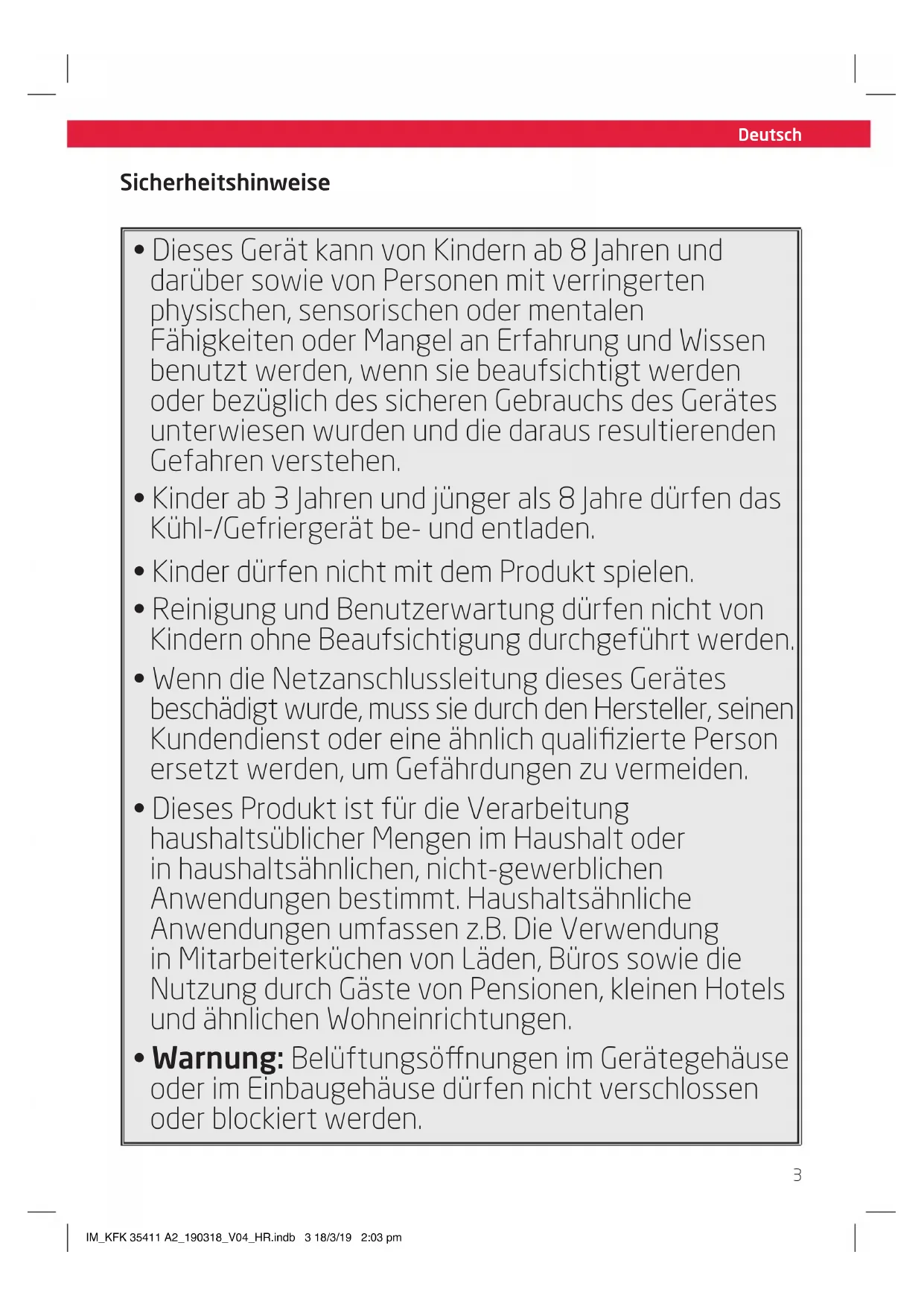- Warnung: Belüftungsönungen im Gerätegehäuse oder im Einbaugehäuse dürfen nicht verschlossen oder blockiert werden. IM_KFK 35411 A2_190318_V04_HR.indb 3 18/3/19 2:03 pmDeutsch